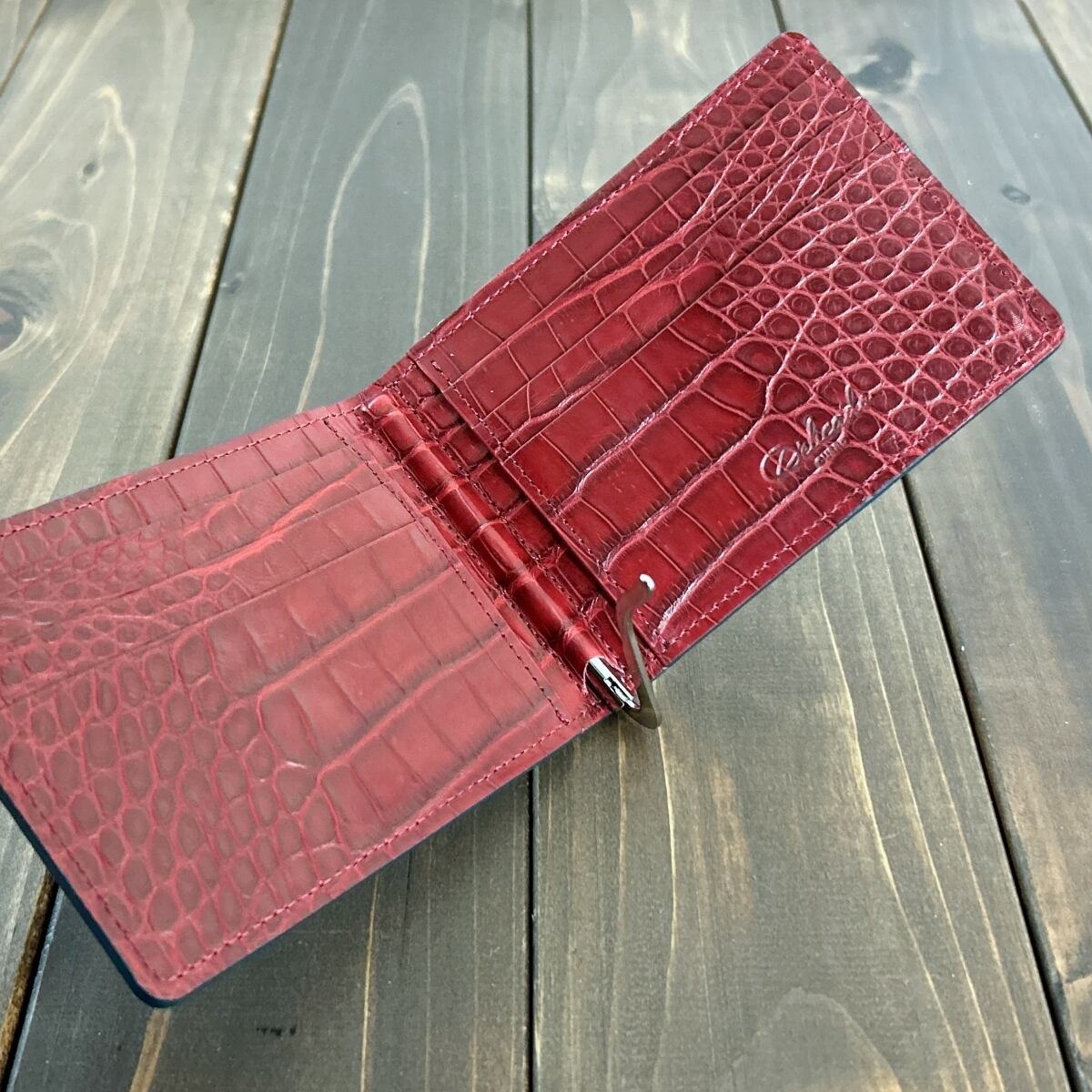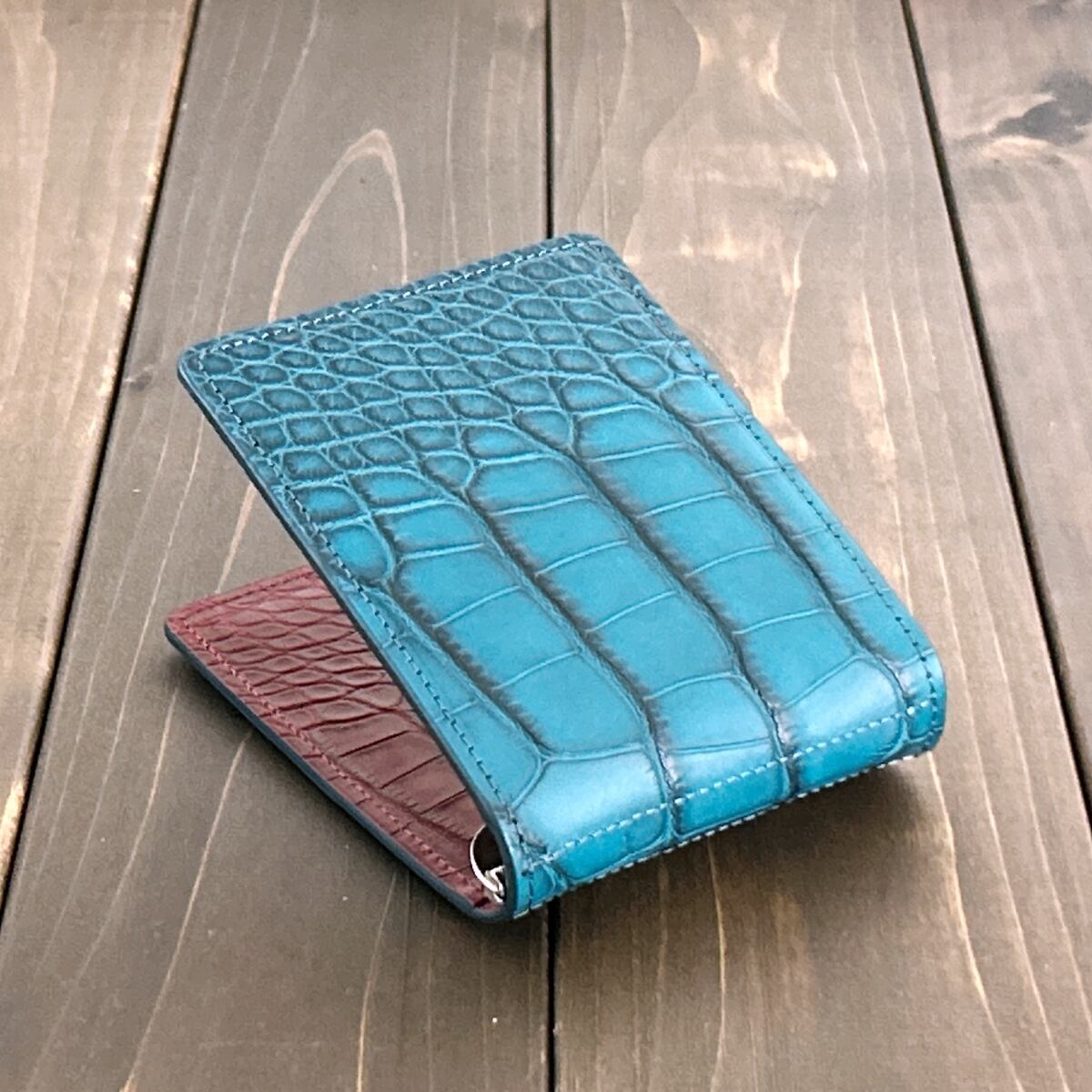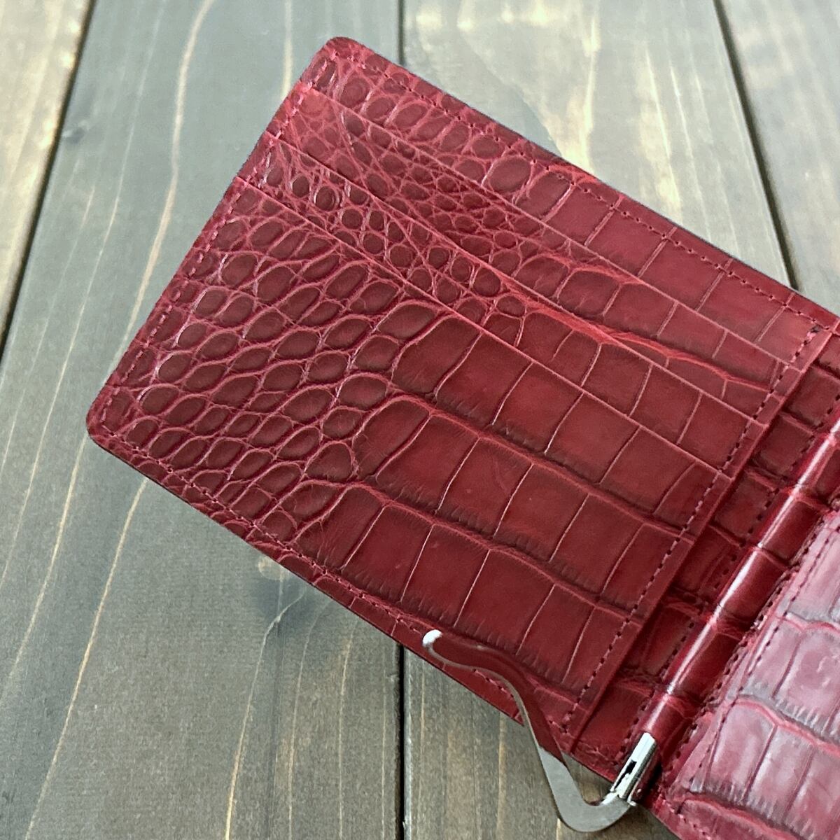 内装には、同加工を施した「ダークレッド」のアリゲーターを惜しみなく使用しました。落ち着いた外装とは対照的な、エキゾチックレザーらしい色気を感じさせる鮮やかなコントラストが魅力です。マットな質感の中に宿るほのかな艶が、使い込むほどに奥行きを増し、手にするたびに至高の満足感を与えてくれます。