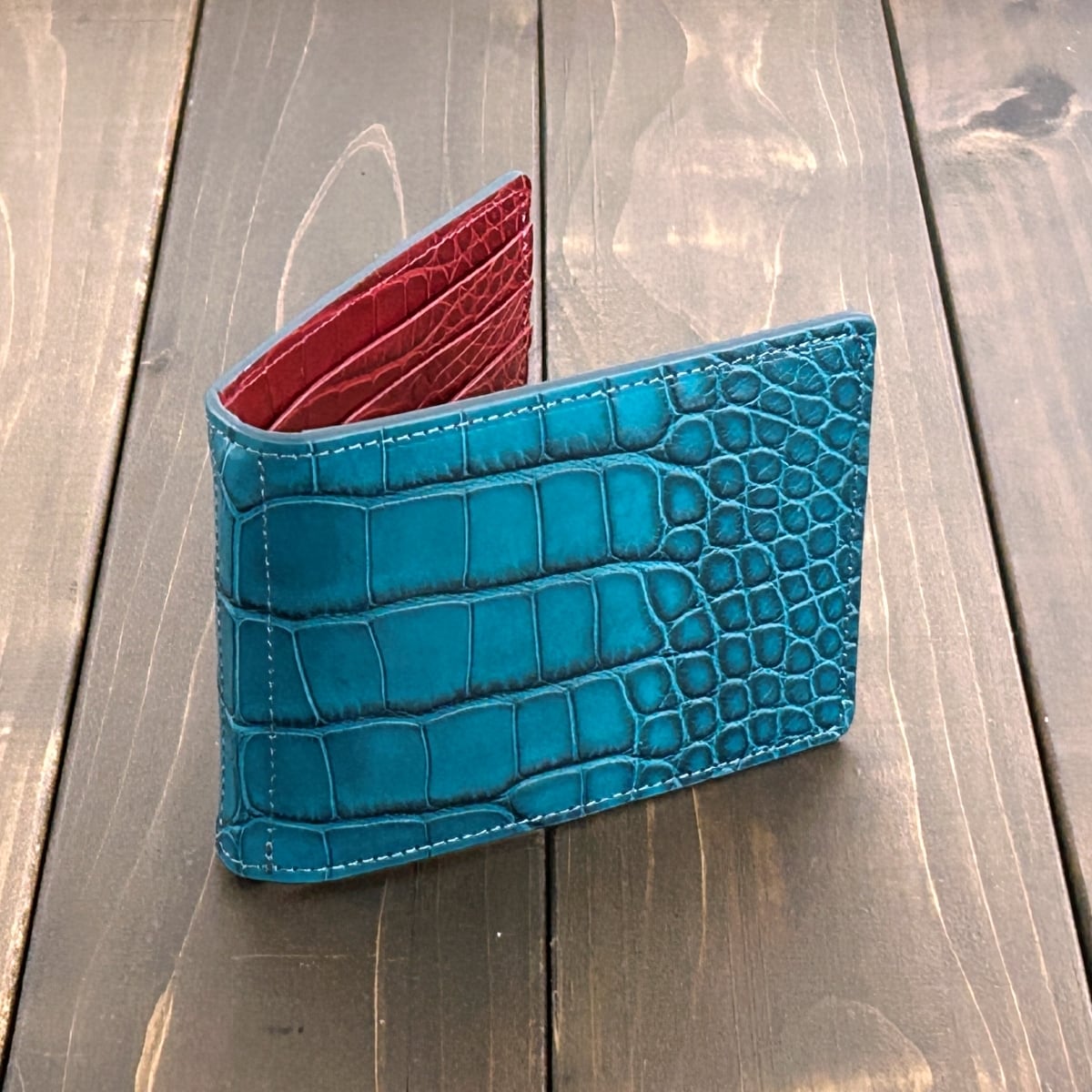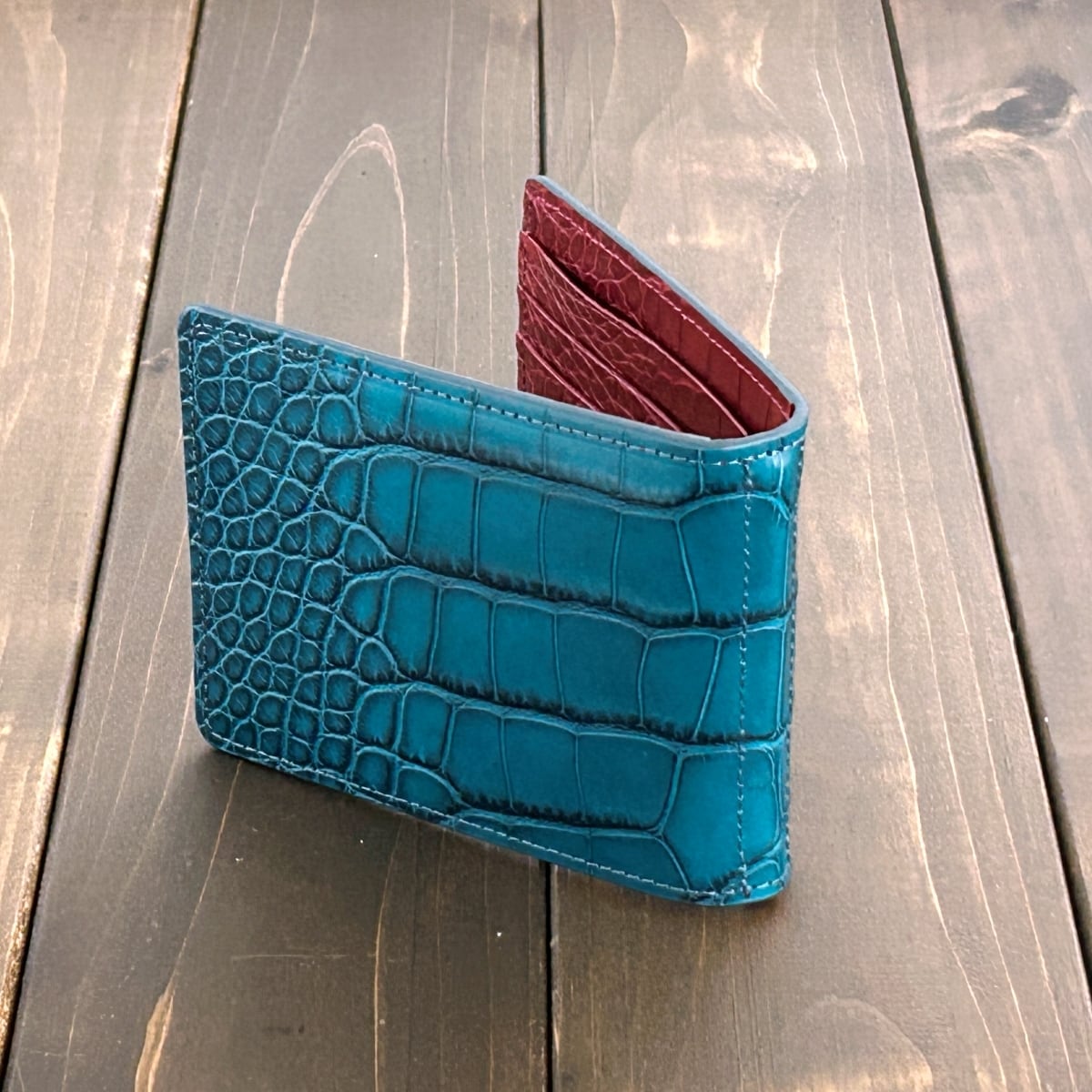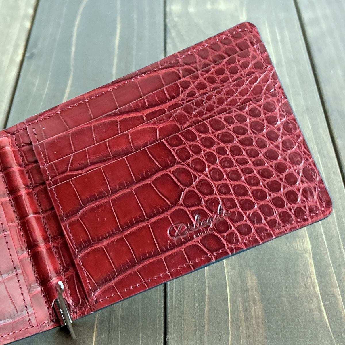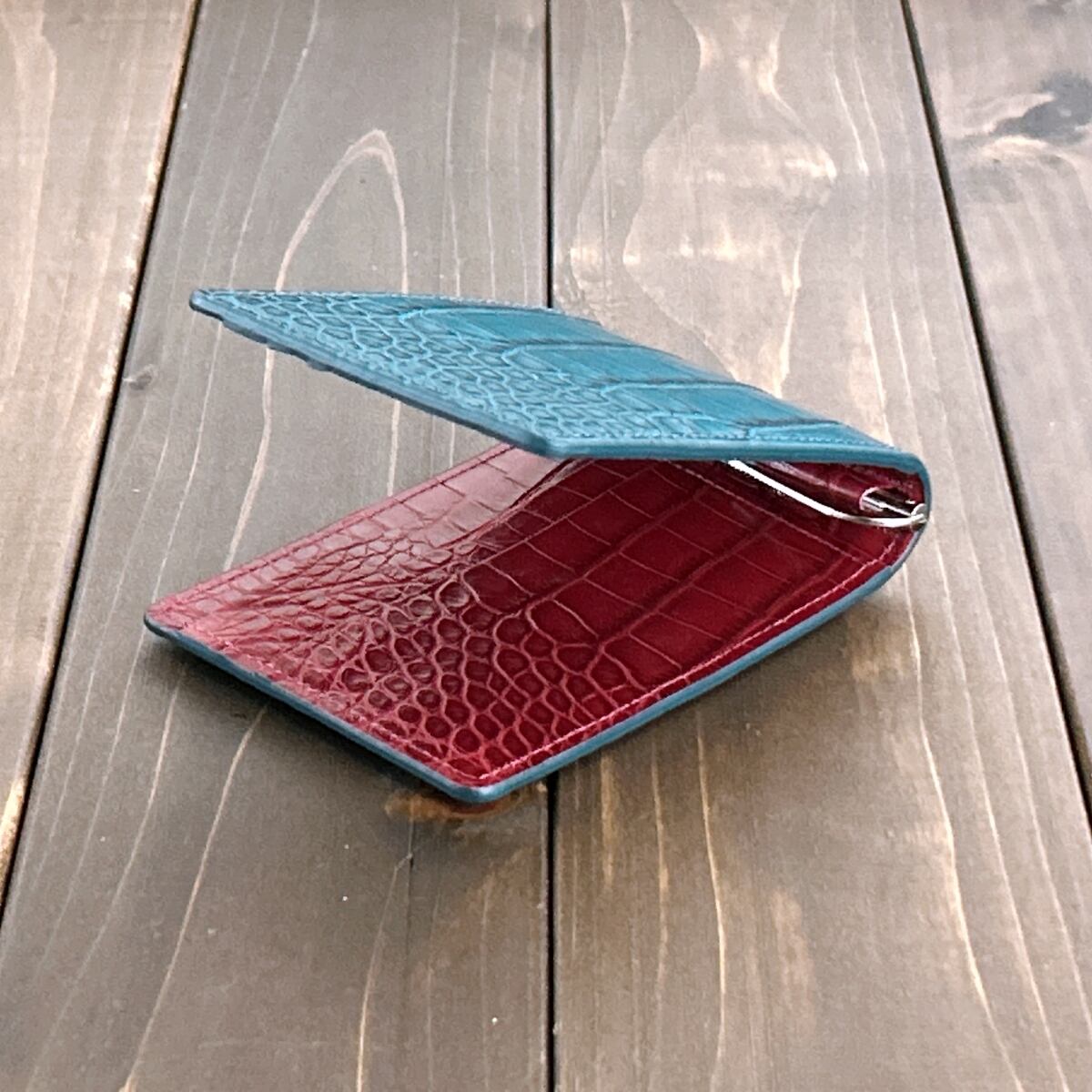 内装には、同加工を施した「ダークレッド」のアリゲーターを惜しみなく使用しました。落ち着いた外装とは対照的な、エキゾチックレザーらしい色気を感じさせる鮮やかなコントラストが魅力です。マットな質感の中に宿るほのかな艶が、使い込むほどに奥行きを増し、手にするたびに至高の満足感を与えてくれます。