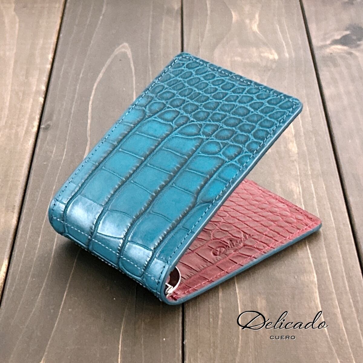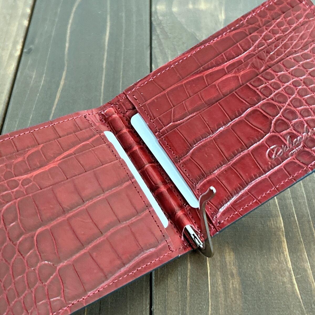 最高級アリゲーターを贅沢に使用したバイカラーの気品あふれるマネークリップ。独自の艶マット加工を施し、凹凸の風合いを引き立てました。さらに、斑のエッジ部分に焼け感や癒えた傷の濃淡を加えることで、革本来の個性的な表情を際立たせ、上質でありながらもワイルドな魅力を備えた仕上がりとなっています。