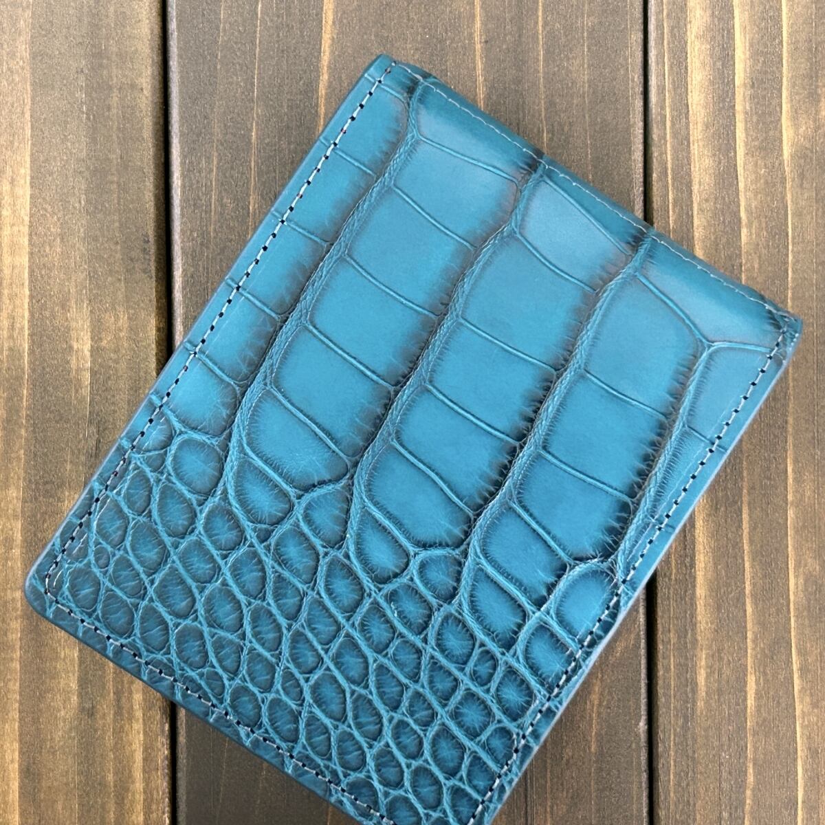 外装には、深みのある「ディープブルー」を採用。アリゲーターのセンター部分を一枚革で贅沢に使用。丸腑から竹腑へと美しく流れるグラデーションを左右対称に整え、端正な印象に仕上げました。