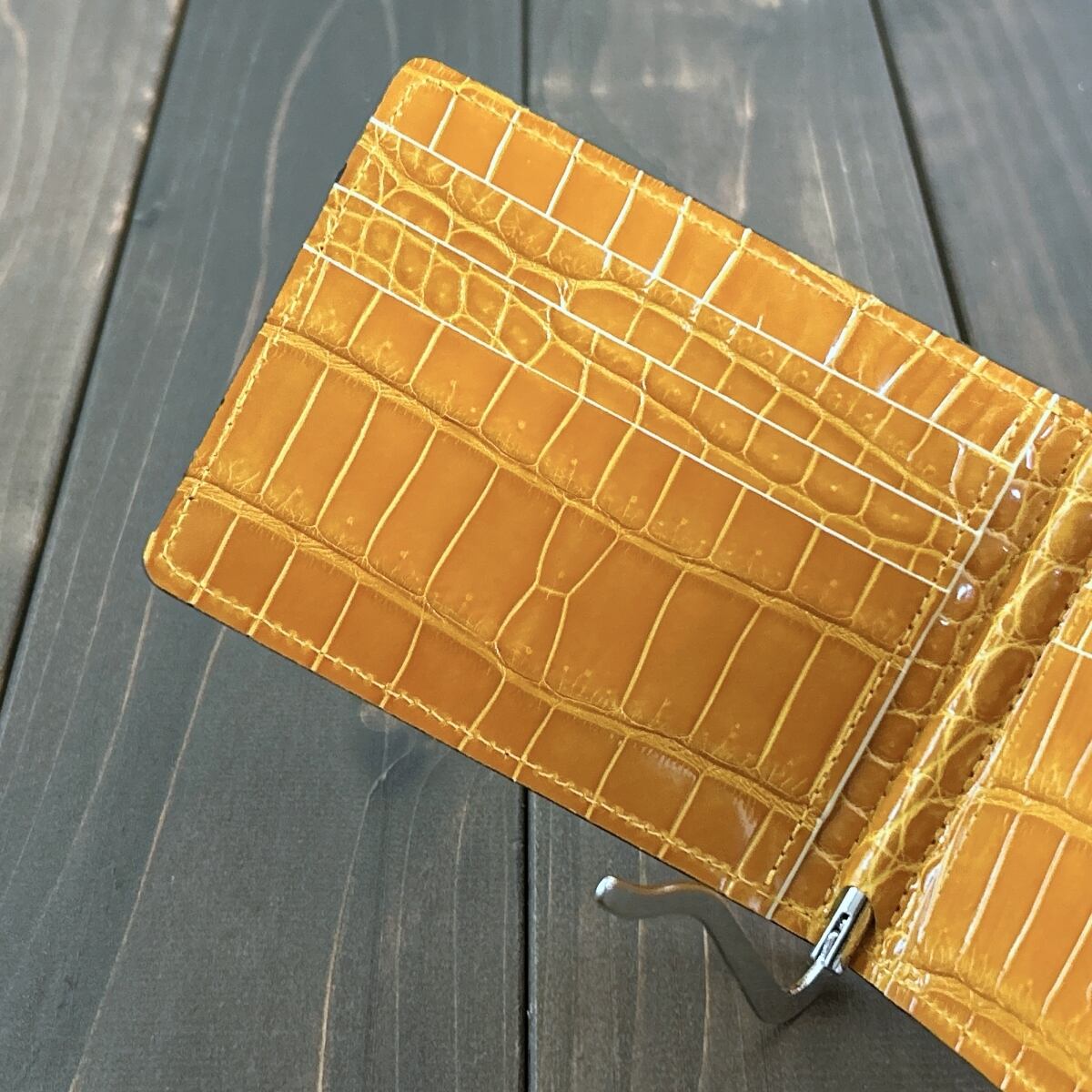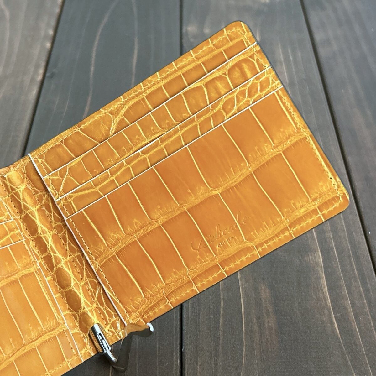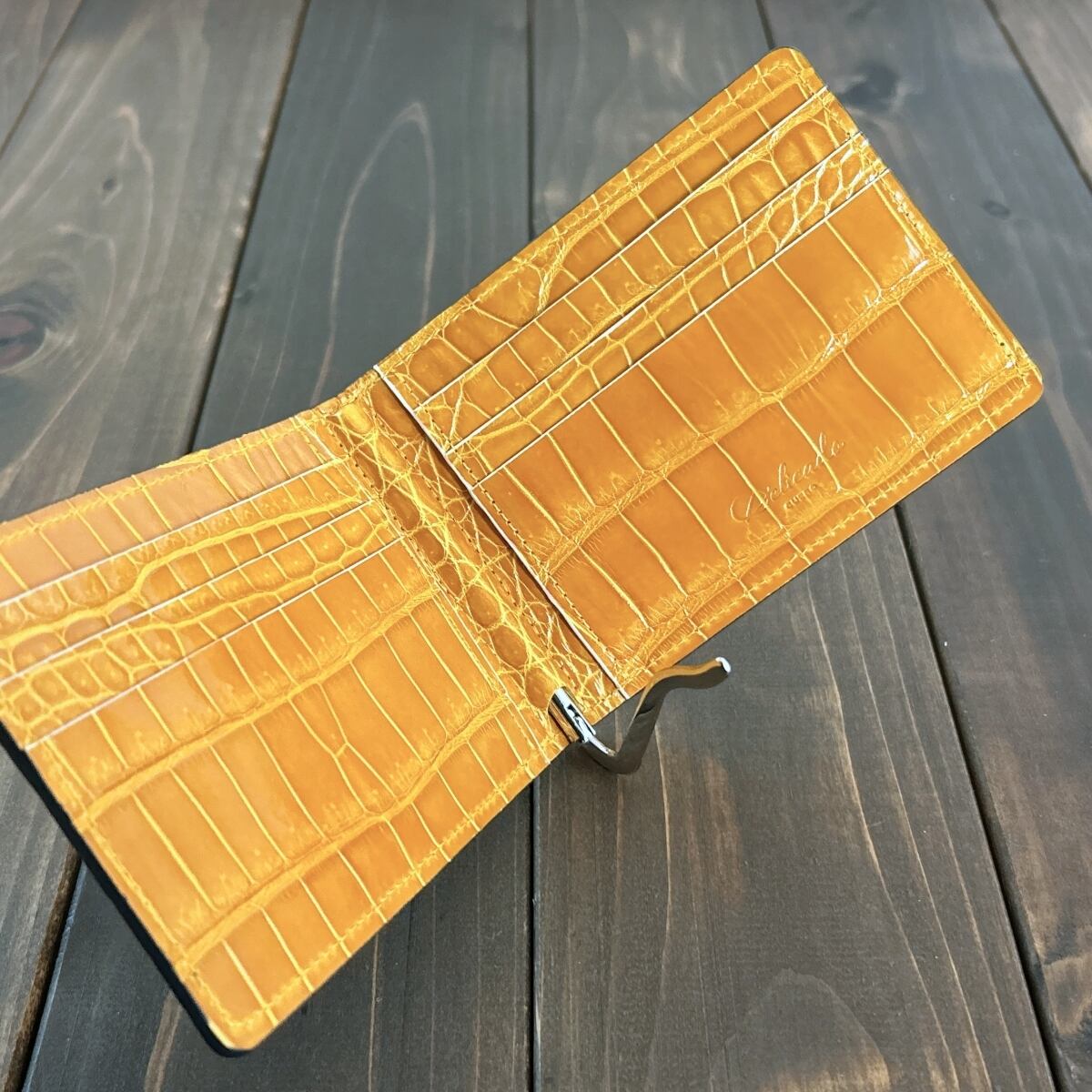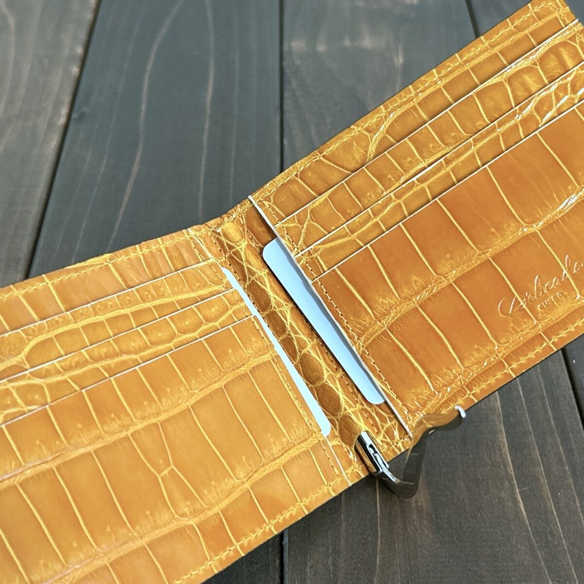 内装には、グレージング加工を施した鮮やかなアンバーイエローのスモールクロコダイルを採用。開いたときにバランスよく見えるよう、左右対称にカットすることで、細部までこだわり抜いた仕上がりに。