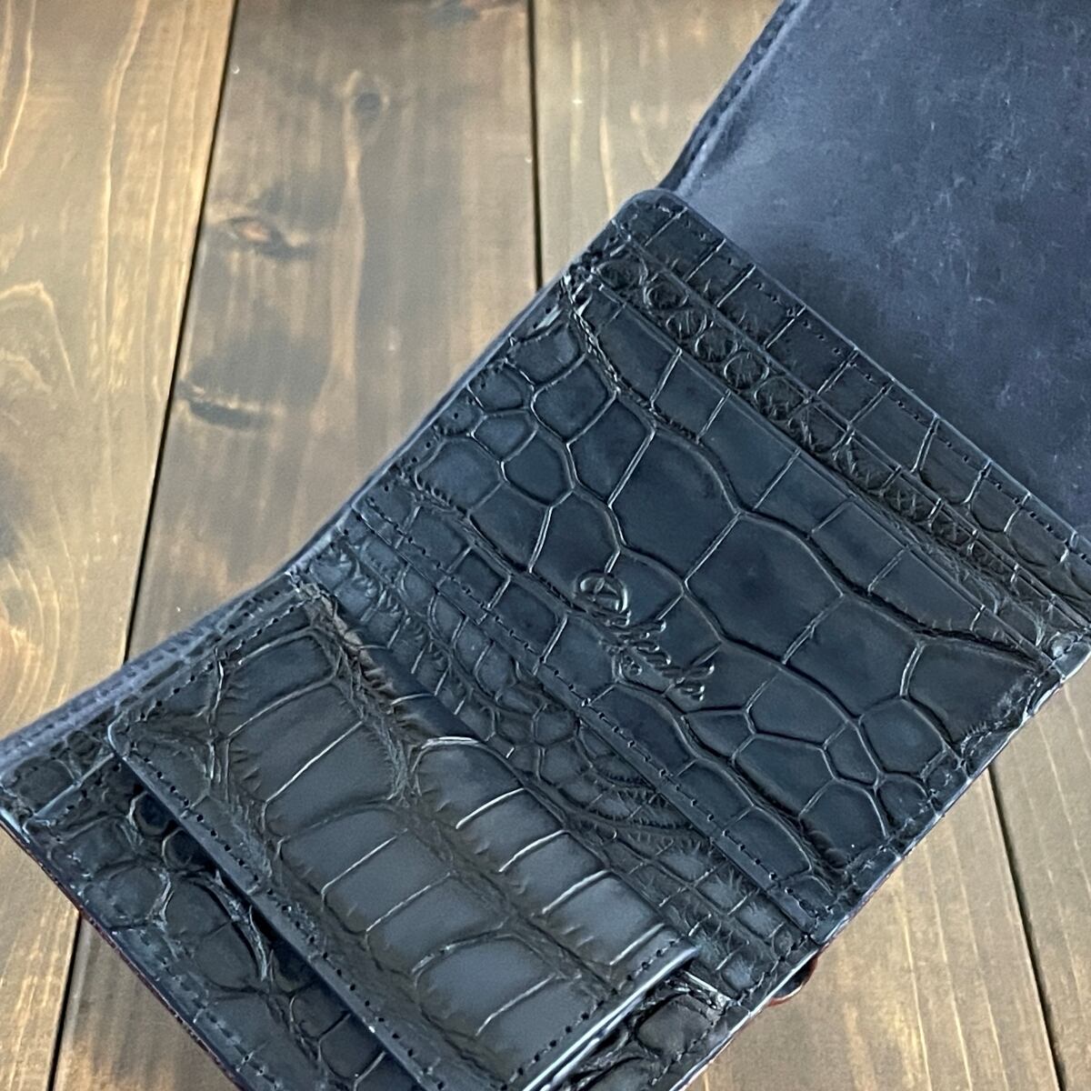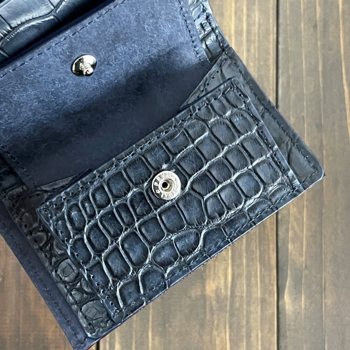 内革には、ブラックに微かなネイビーが交じったアリゲーターを使用。こちらも艶マット加工で深みのある濃淡を加え、豊かな表情を演出しています。札入れには、Virgilio社製「MARGOT(マルゴー)」のイタリアンレザーを採用。表面にはスクラッチ加工が施され、使い込むほどに増す深みと独特の風合いが魅力です。