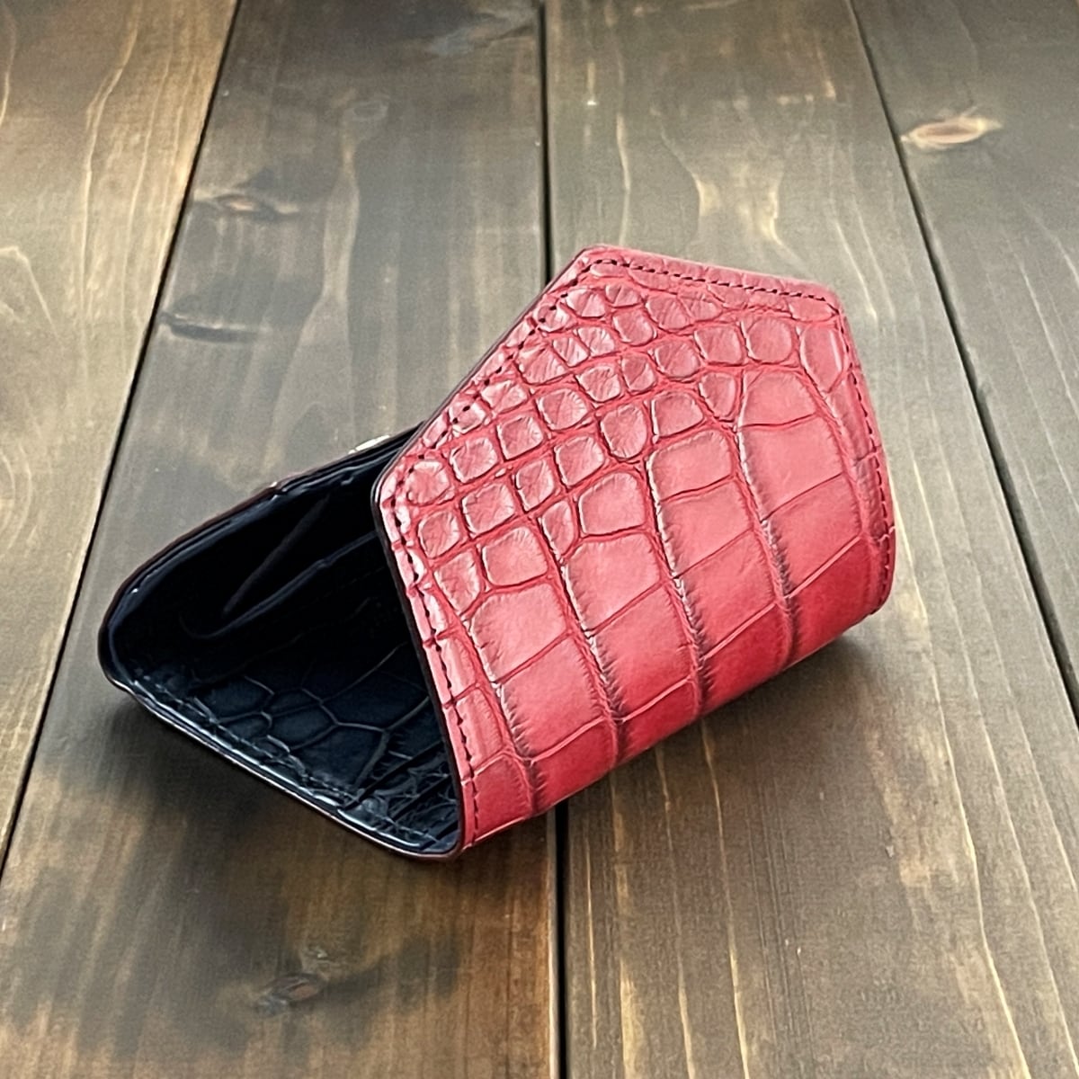 外革には深みのあるレッドのアリゲーターを採用。艶マット加工で腑のエッジに繊細な濃淡を加え、立体感のある表情を生み出しています。センター部分(肚部分)の一枚革を選び、フォルムの曲線美を際立たせるため横向きに裁断し、丸腑から竹腑へと流れる自然なグラデーションが美しく仕上がっております。