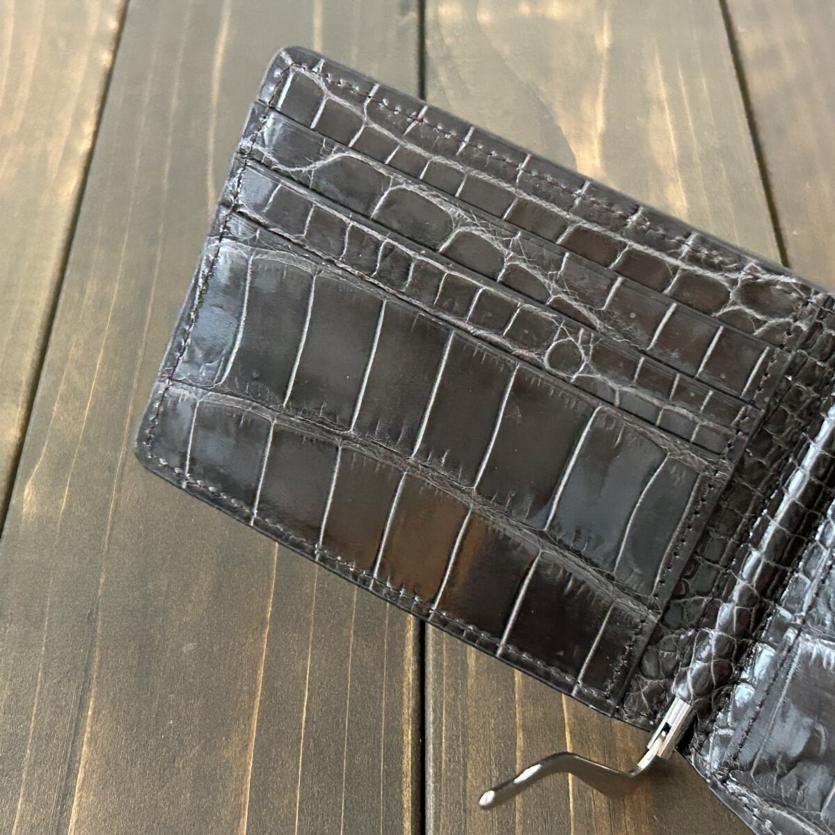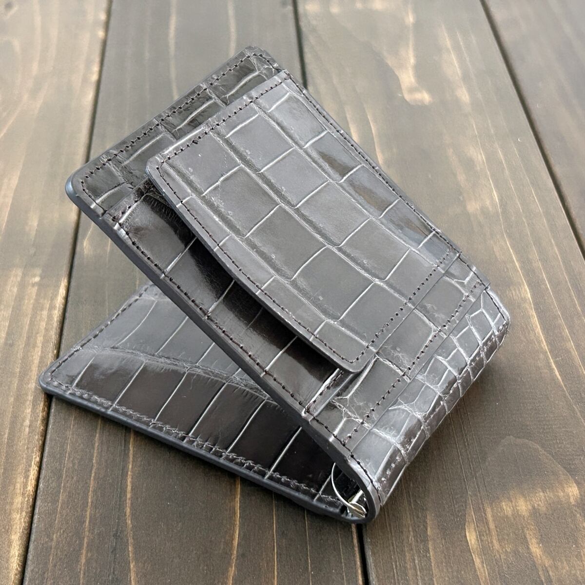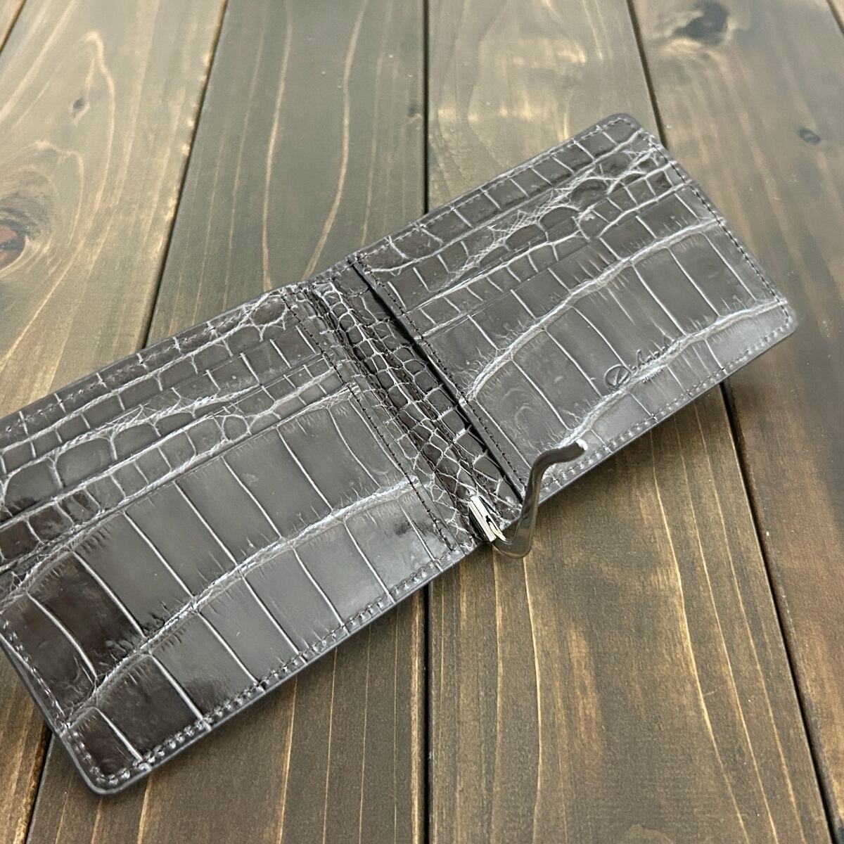 最高級のスモールクロコダイルを惜しみなく使用した、グレージュカラーのマネークリップ。グレージング加工を施すことで、革本来の美しさと艶やかな光沢を最大限に引き出しました。内外すべてをクロコダイルで仕立てた無双仕様は、手にするだけで格別の存在感を放ちます。