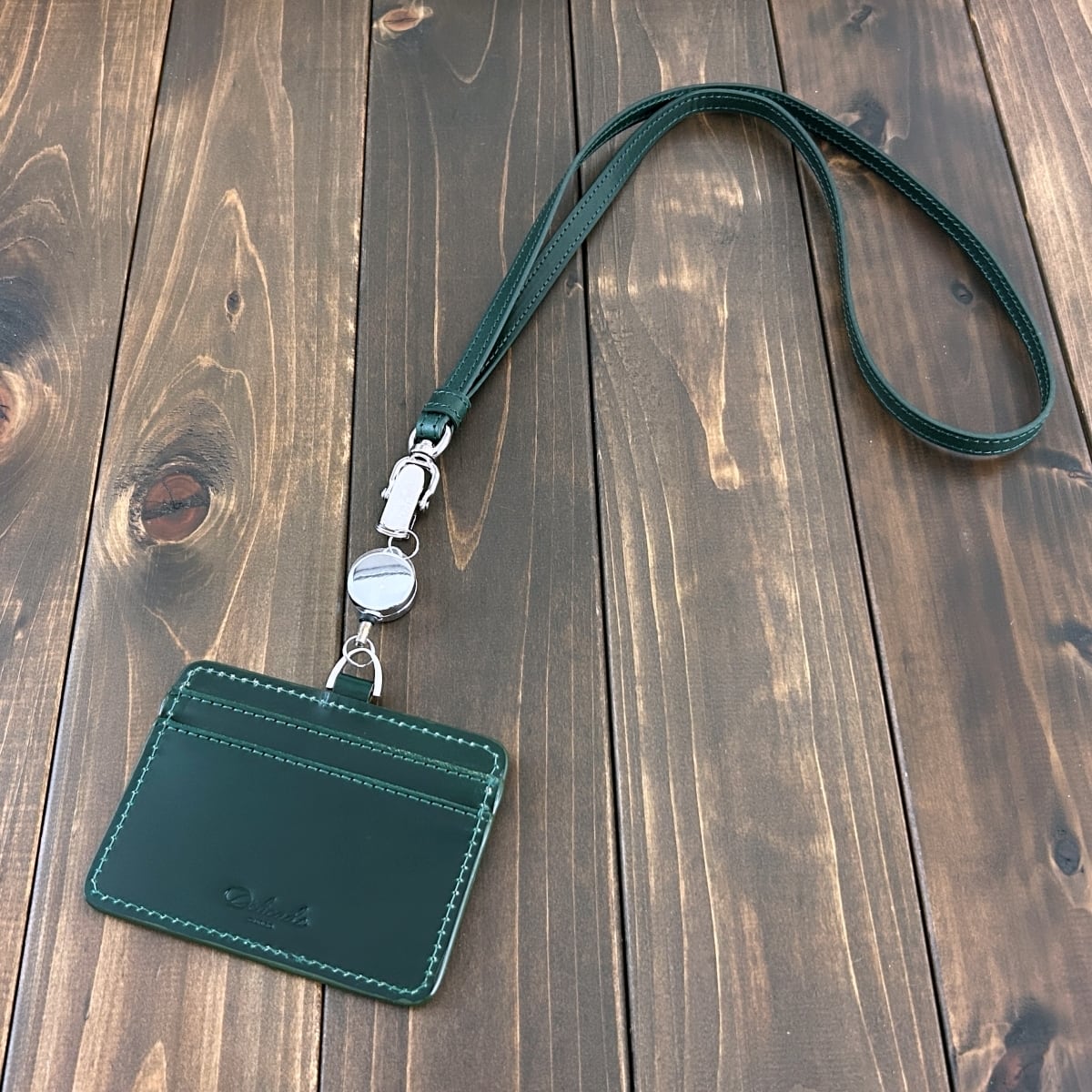 レーデルオガワ社のコードバンを使用したIDホルダー。アニリン染めを施したグリーンは、透明感のある深みと奥行きが特徴で、コードバンならではの美しい艶と相まって、気品ある表情を引き立てます。落ち着いたグリーンはビジネスシーンにも自然に馴染み、装いに上質な彩りを添えてくれます。