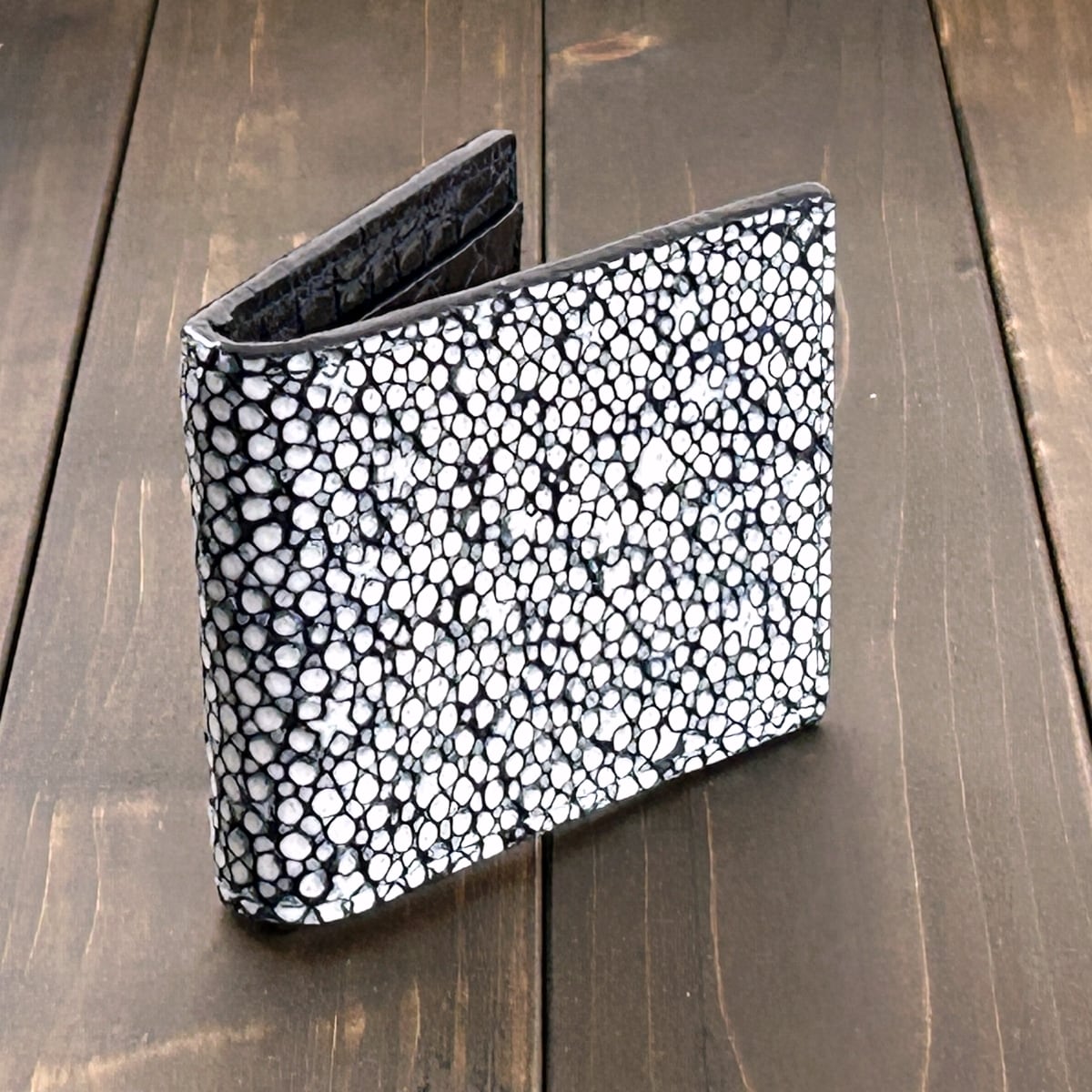スティングレイは「海の宝石」と言われ、キラキラと輝く美しさに高級感を感じる一品です。その中でも革全体が星形で覆われているものをスタースティングレイと呼び、稀にしか獲れない本当に珍しいレアものです。別名「梅花皮鮫」とも言われ、江戸時代に日本刀の鞘(刀を納める筒)などもに使われた歴史ある貴重な革となります。