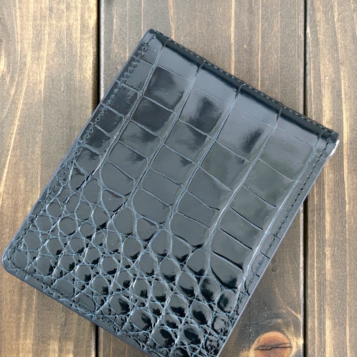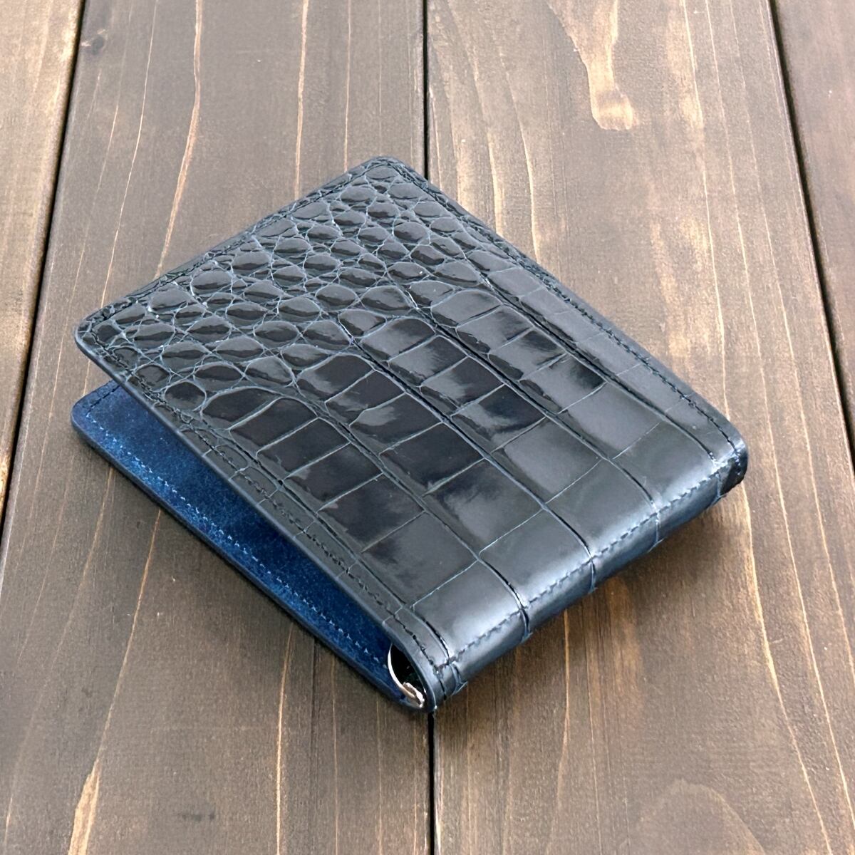 最高級のスモールクロコダイルに、宝石のような気品あふれる光沢を放つグレージング加工を施したマネークリップです。カラーは、限りなく黒に近い深みの中に知的な青みが宿るダークネイビーを採用しました。 あえて小ぶりなサイズのクロコダイルを厳選することで、センター部分の一枚革から生まれる「丸腑から竹腑へと流れる緻密なグラデーション」を左右対称に美しく表現しています。スモールクロコダイルならではの繊細な腑模様が際立つ、端正で洗練された仕上がりです。