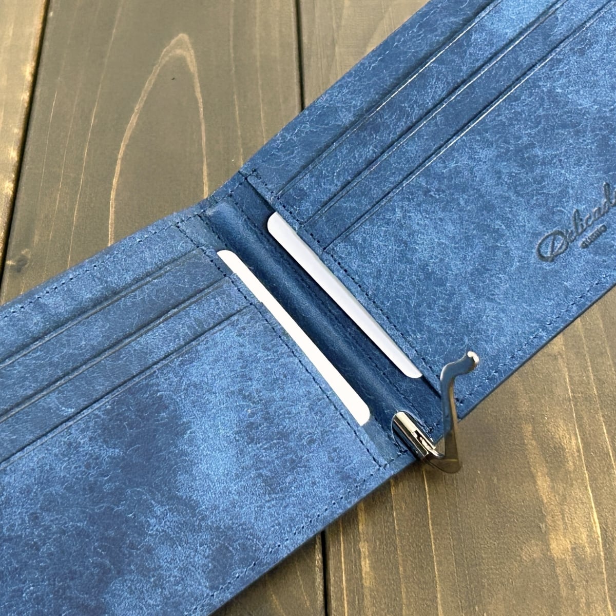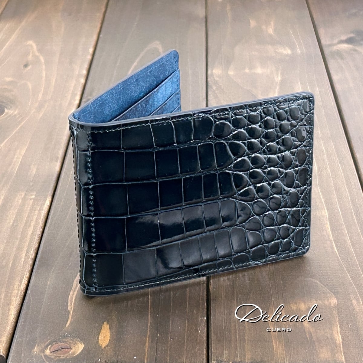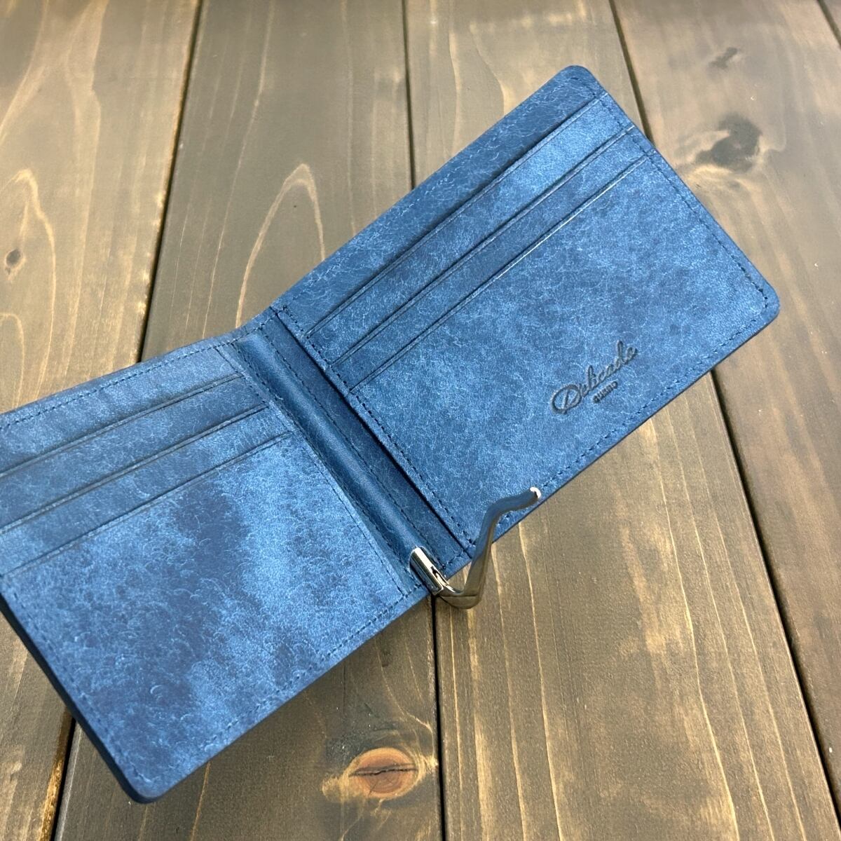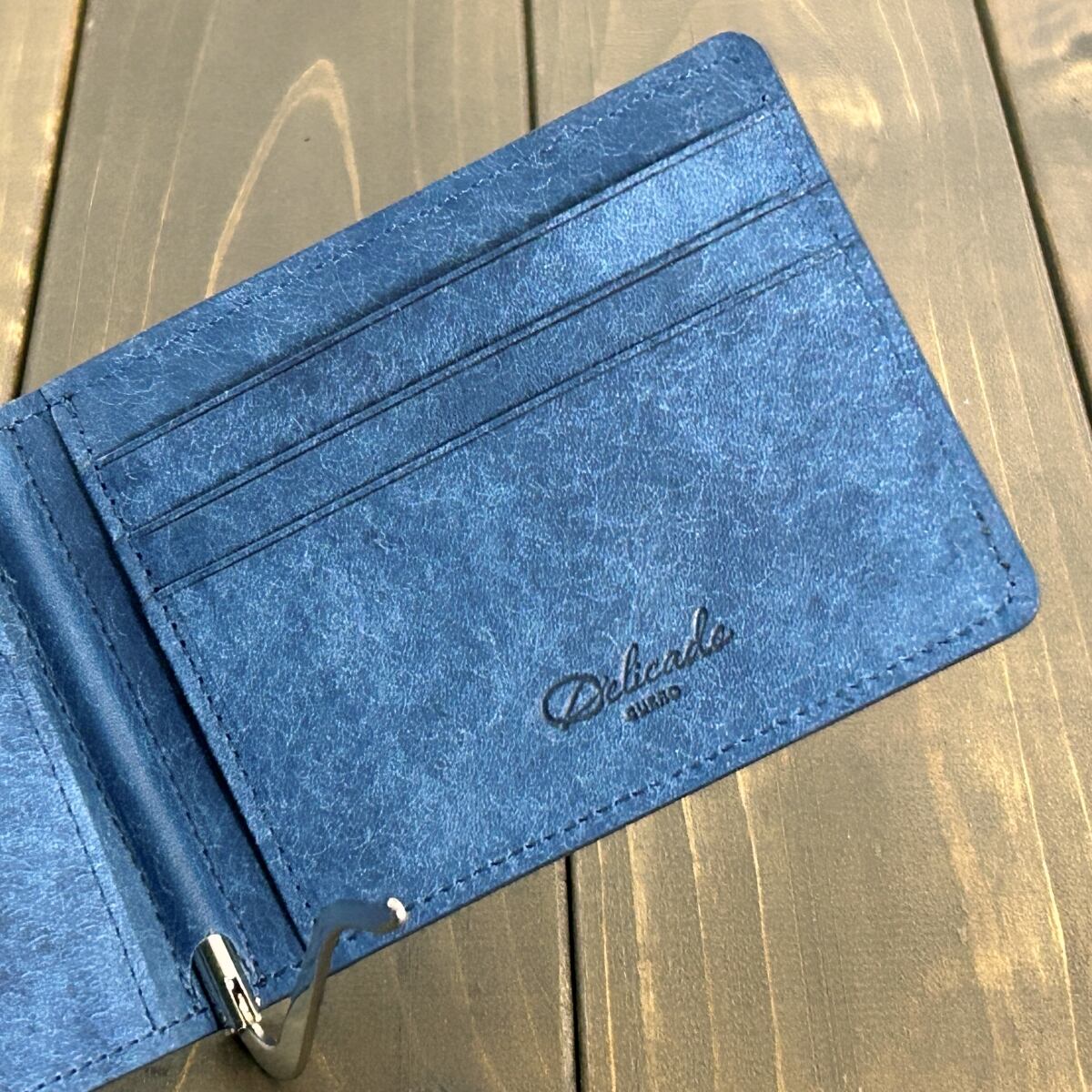 内装には、イタリア・トスカーナ州の老舗タンナー Virgilio社製の「MARGOT(マルゴー)」から、鮮やかなコバルトカラーをセレクトしました。表面に施されたスクラッチ加工による絶妙なムラ感が、ヴィンテージのような奥深い表情と豊かなテクスチャーを生み出しています。ダークネイビーのクロコダイルとイタリアンレザーが織りなす、鮮やかなバイカラーのコントラストが魅力です。