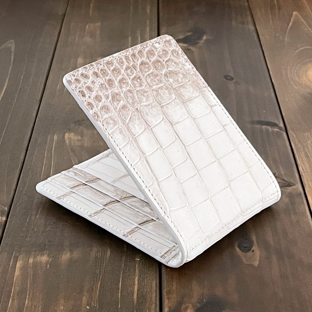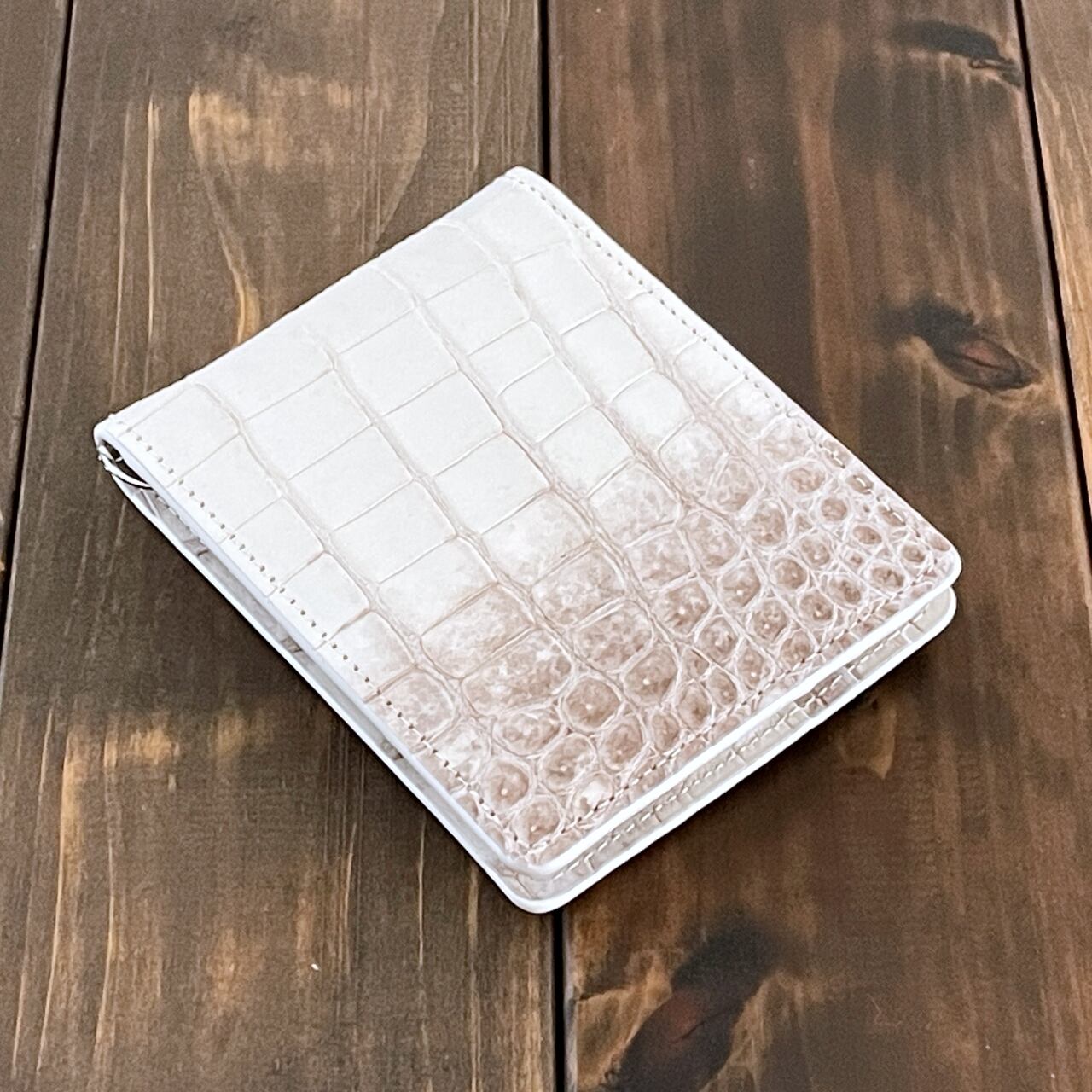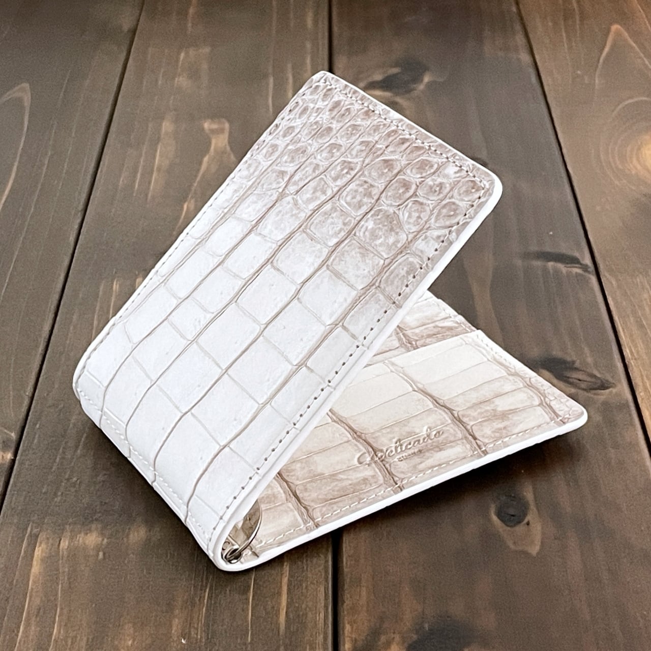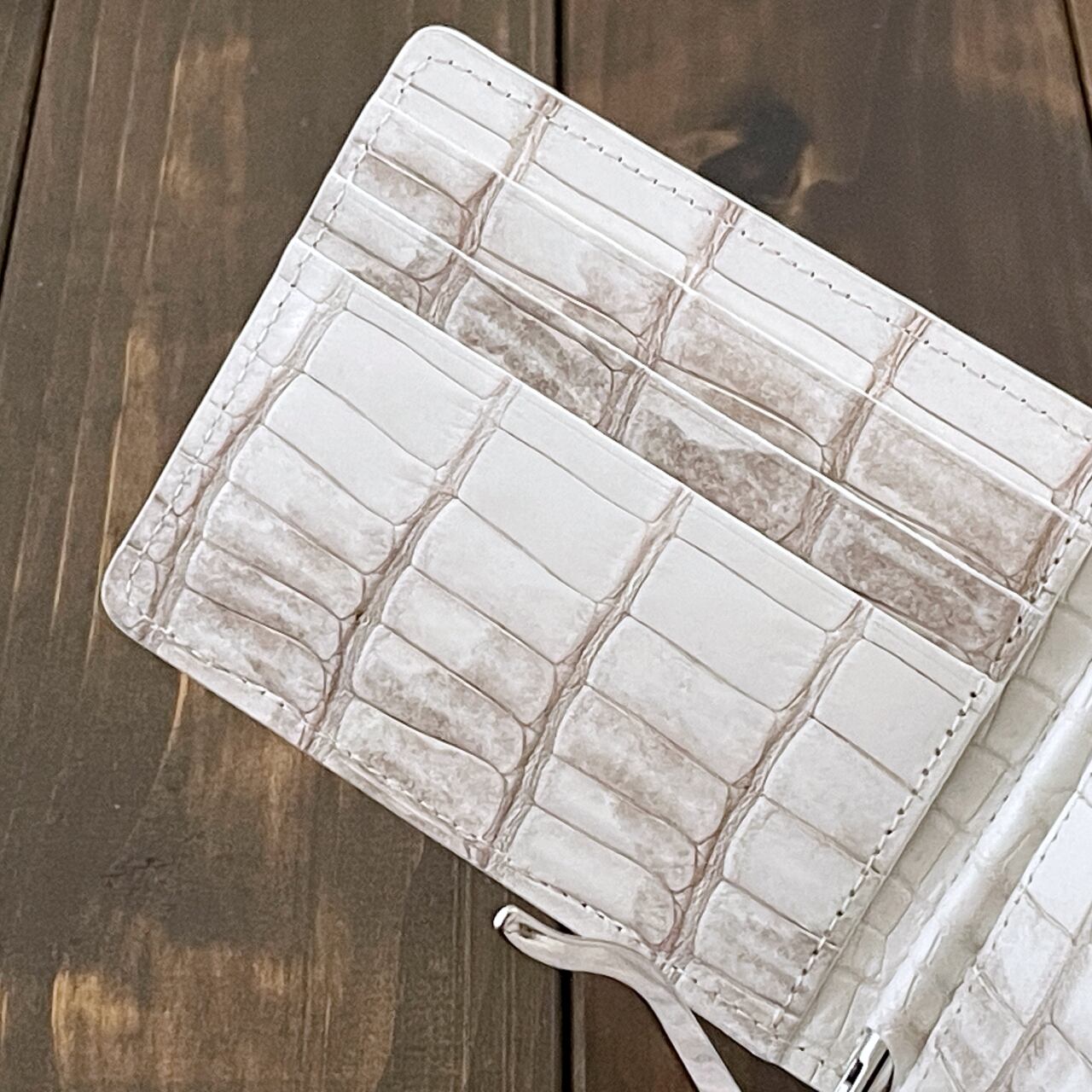 ヒマラヤクロコダイルは、ヒマラヤ山脈の雪解けを思わせる、白からベージュへと移ろう美しいグラデーションが特徴の希少なレザーです。本製品には、最高級スモールクロコダイル(ポロサス)を贅沢に使用しました。