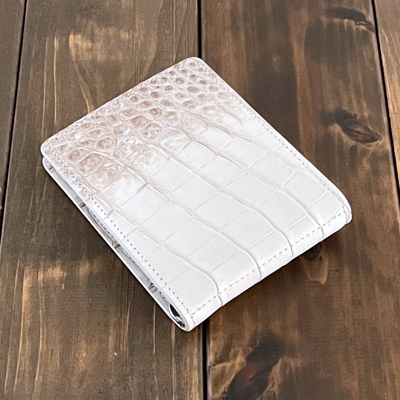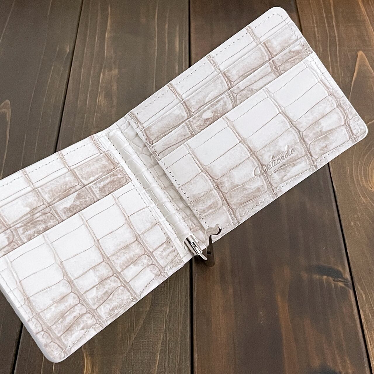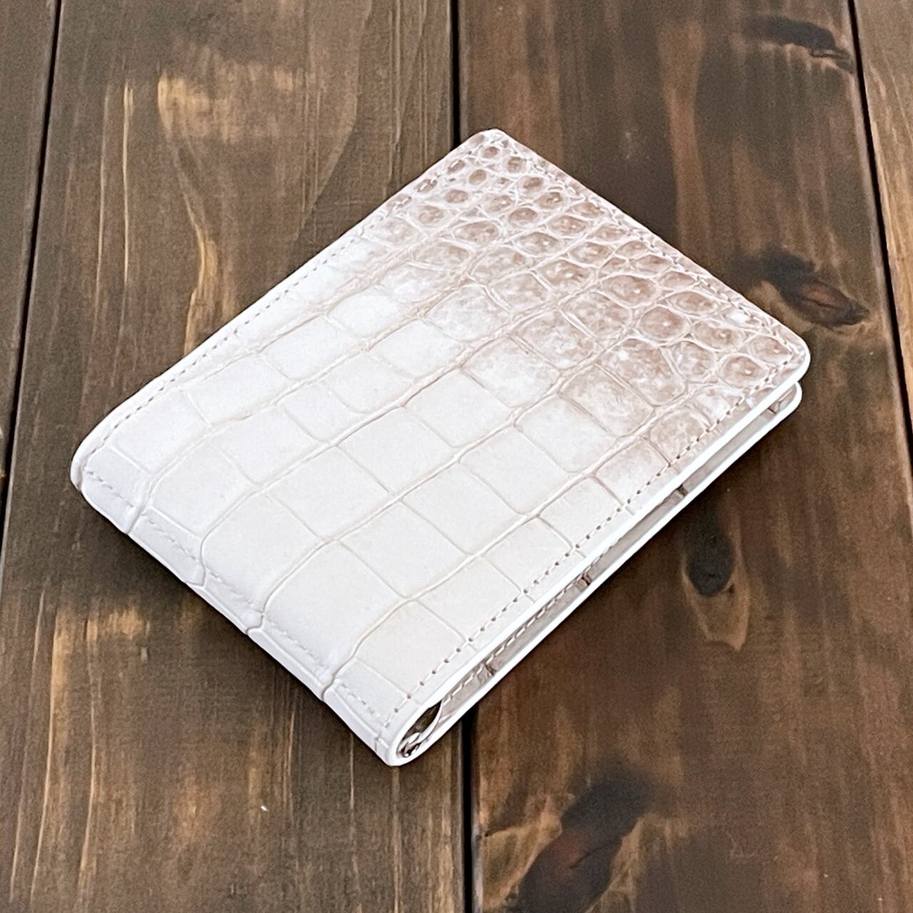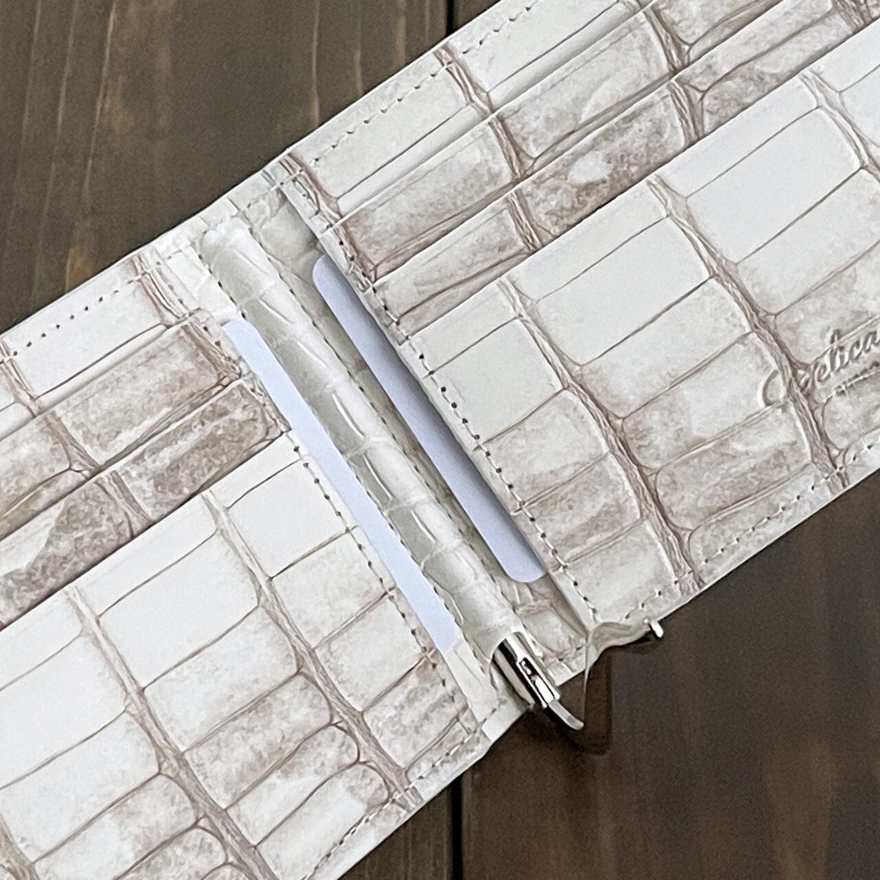 ヒマラヤクロコダイルは、ヒマラヤ山脈の雪解けを思わせる、白からベージュへと移ろう美しいグラデーションが特徴の希少なレザーです。本製品には、最高級スモールクロコダイル(ポロサス)を贅沢に使用しました。
