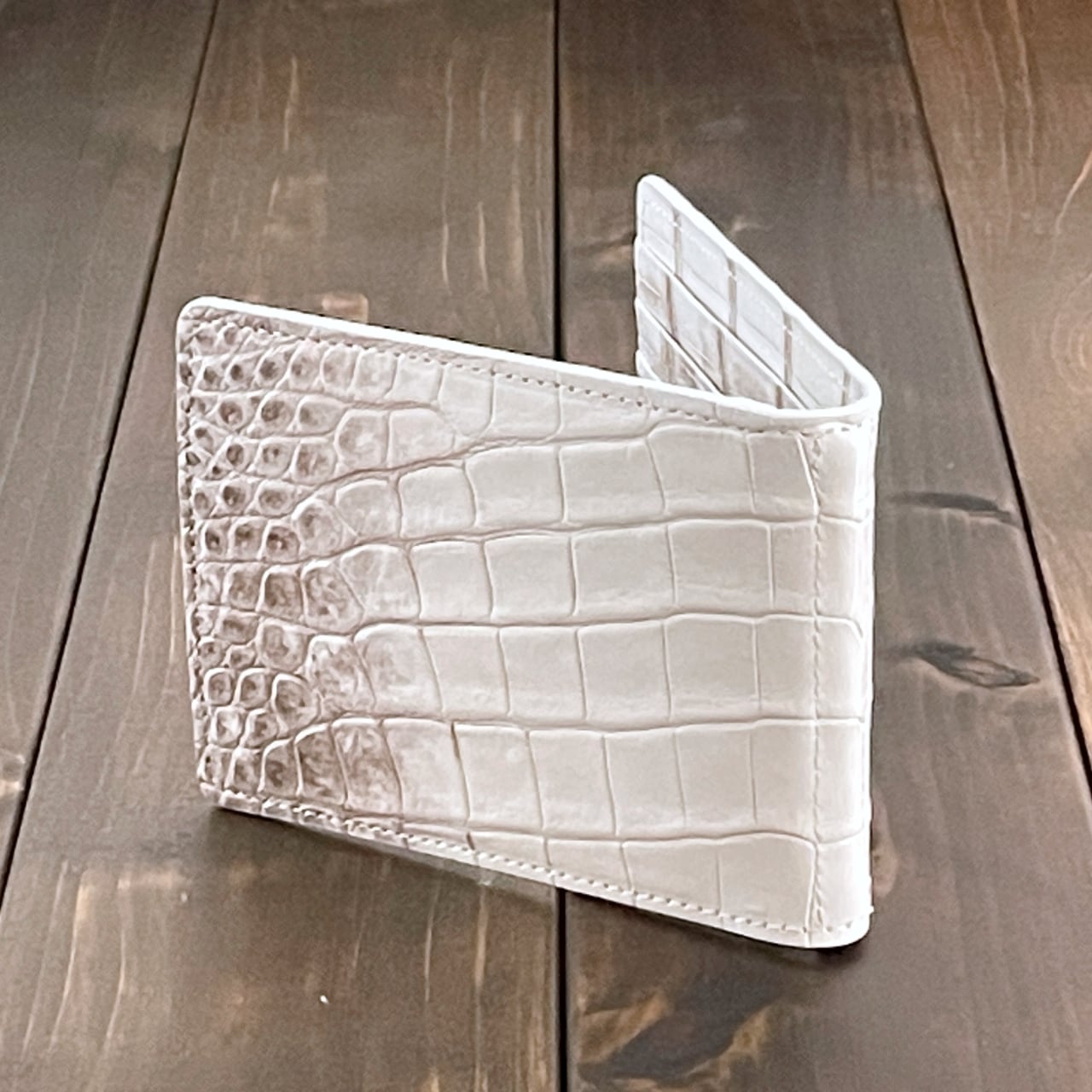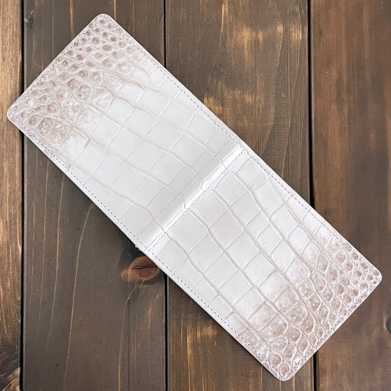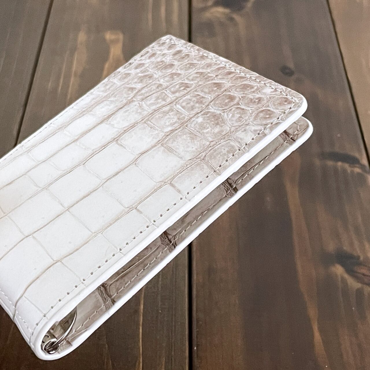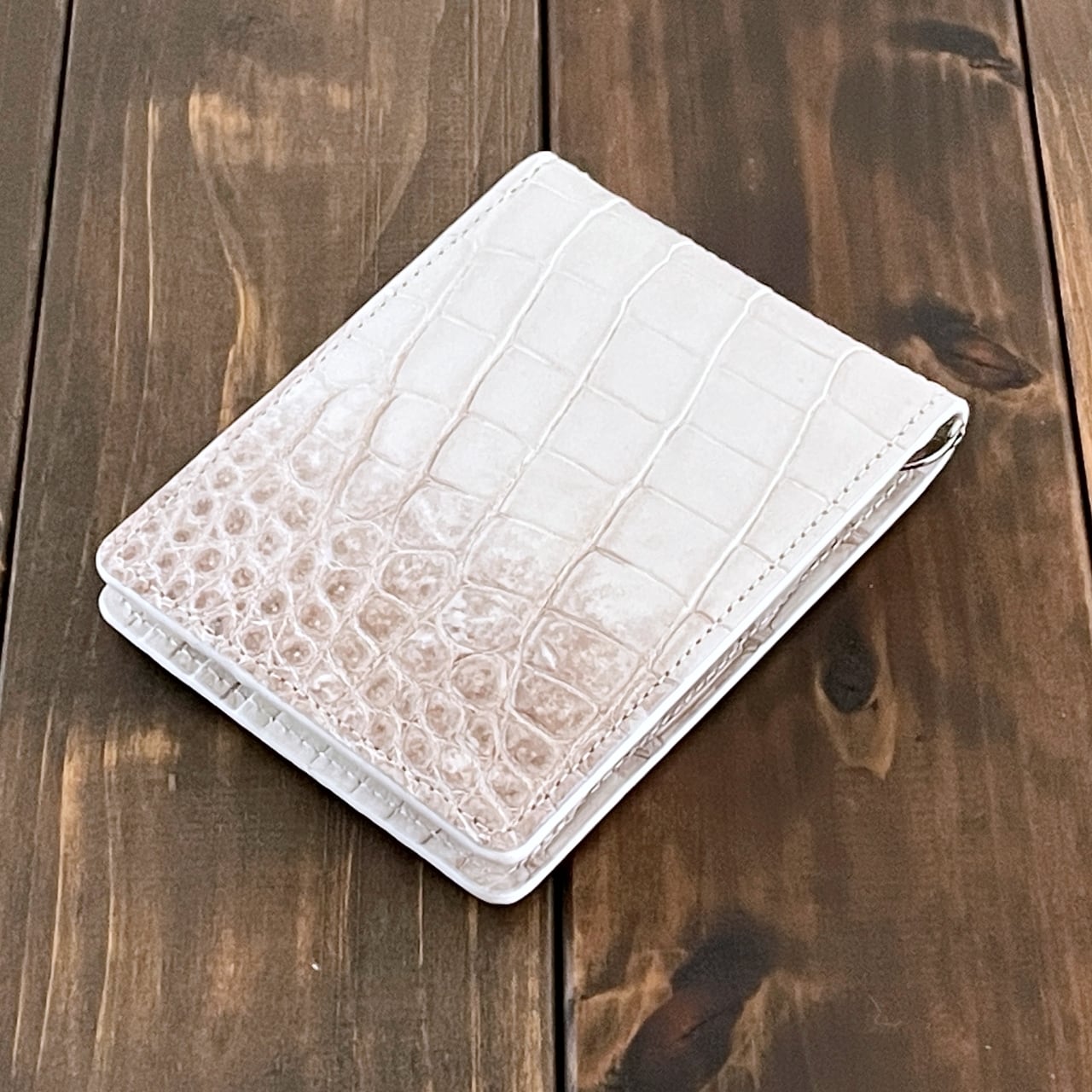 ヒマラヤクロコダイルは、ヒマラヤ山脈の雪解けを思わせる、白からベージュへと移ろう美しいグラデーションが特徴の希少なレザーです。本製品には、最高級スモールクロコダイル(ポロサス)を贅沢に使用しました。