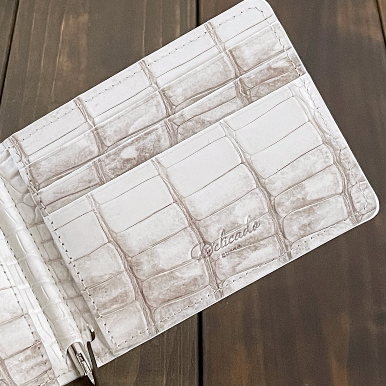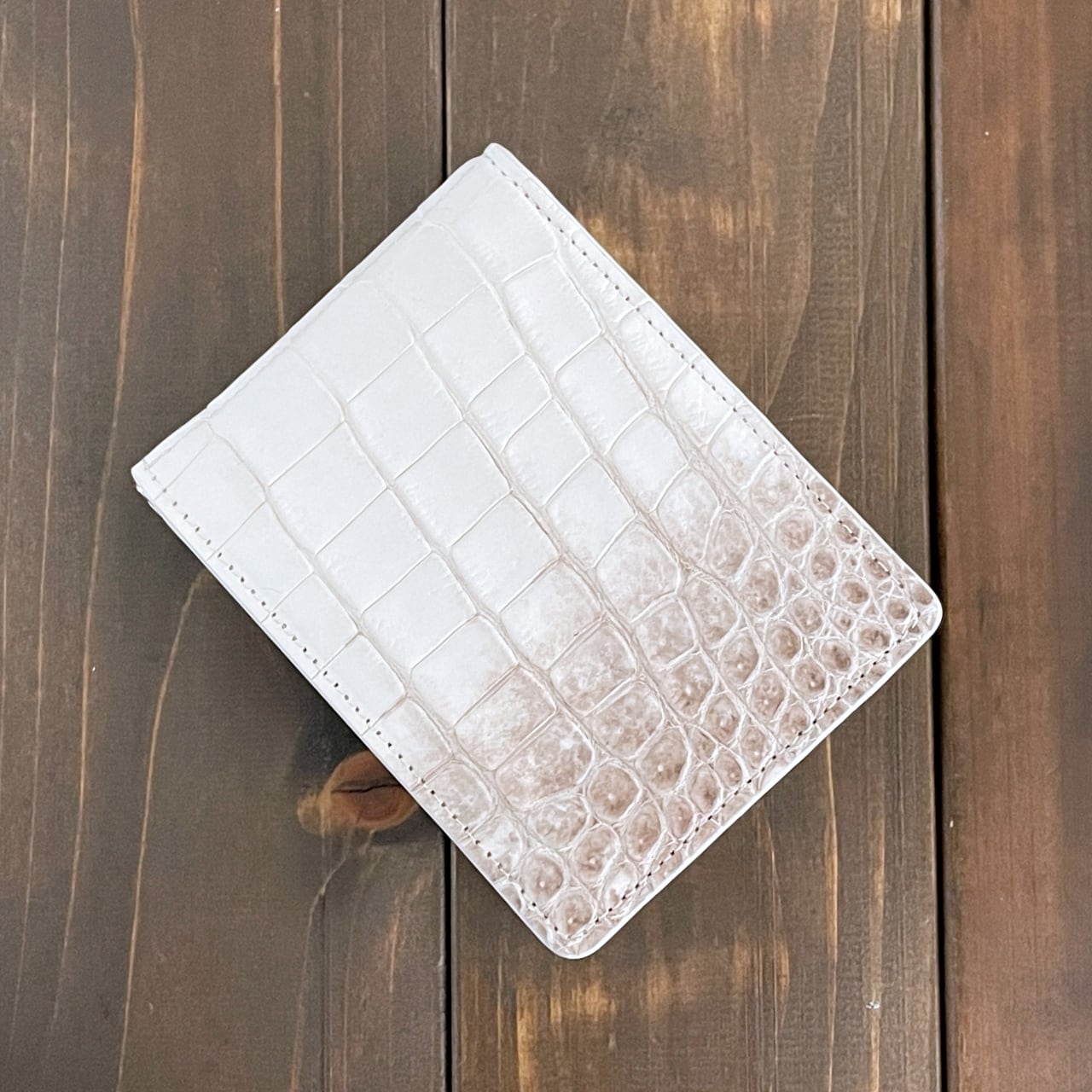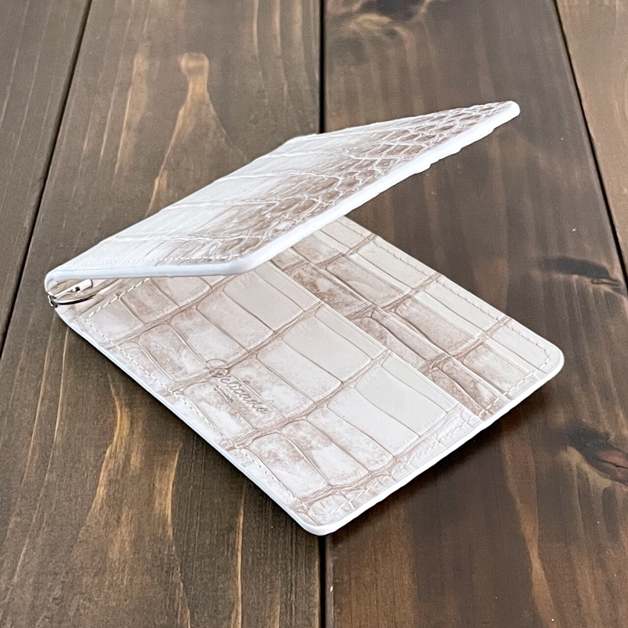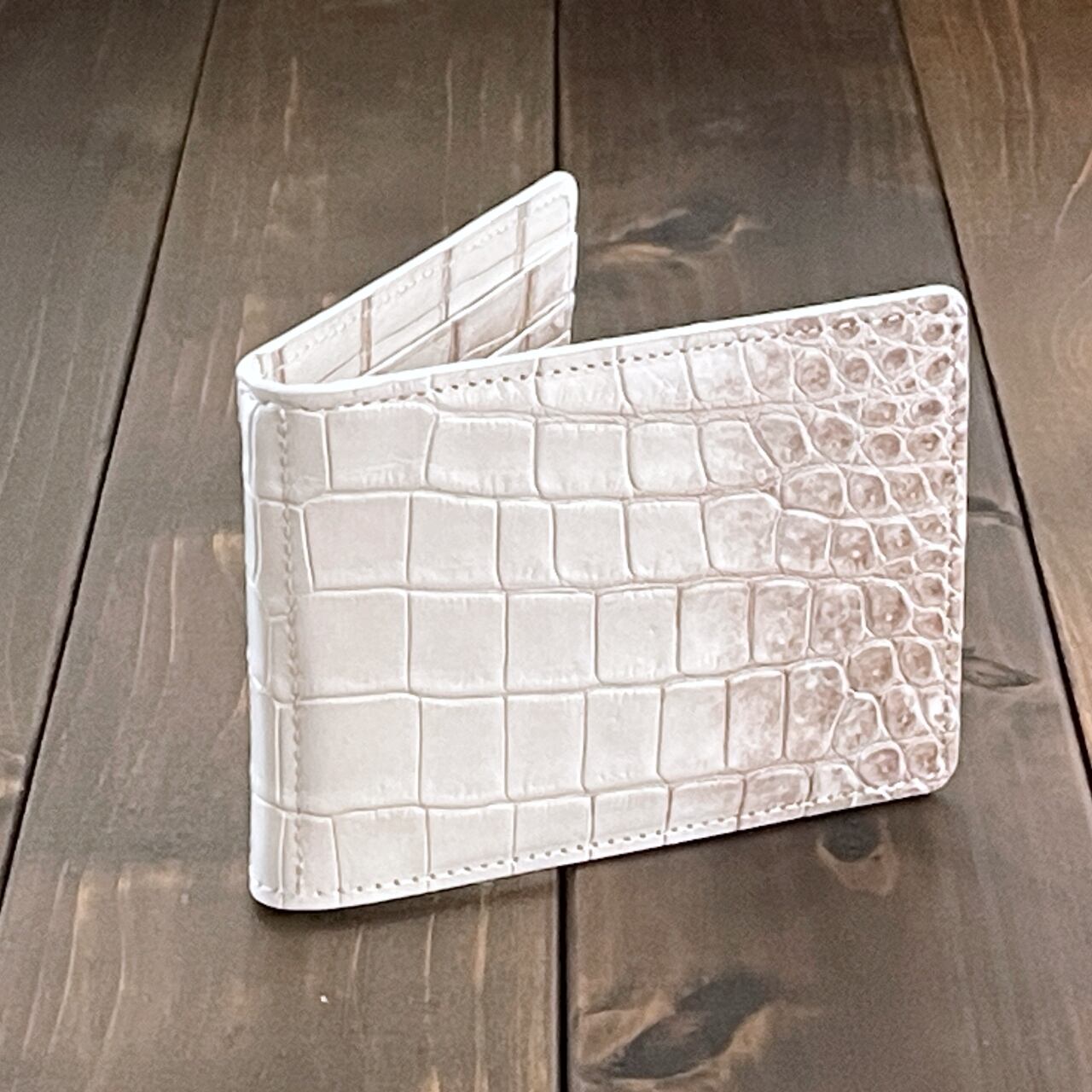 ヒマラヤクロコダイルは、ヒマラヤ山脈の雪解けを思わせる、白からベージュへと移ろう美しいグラデーションが特徴の希少なレザーです。本製品には、最高級スモールクロコダイル(ポロサス)を贅沢に使用しました。