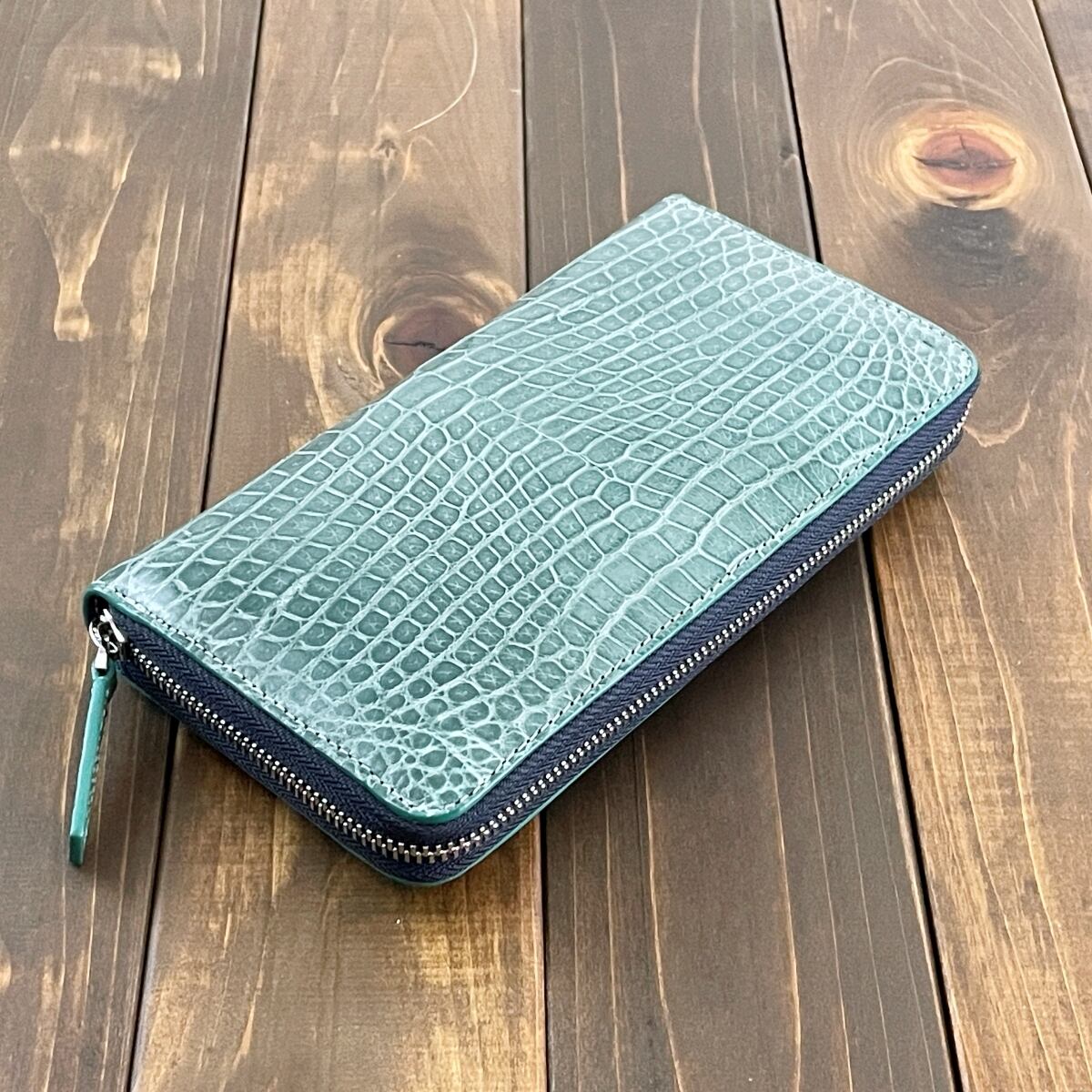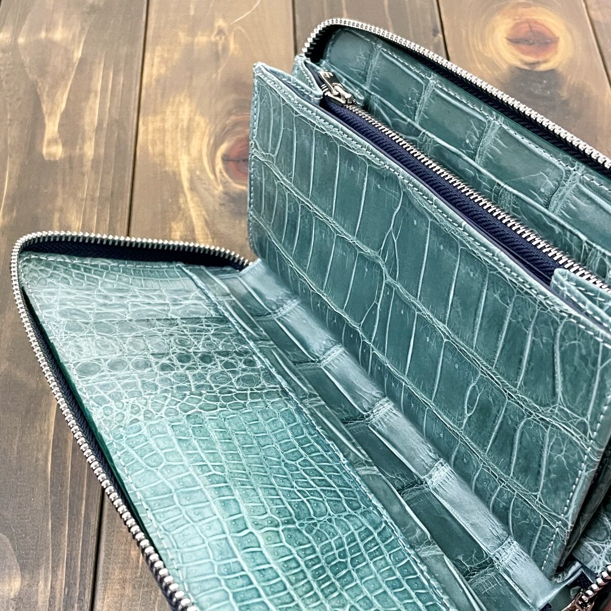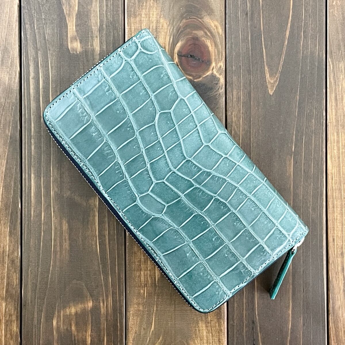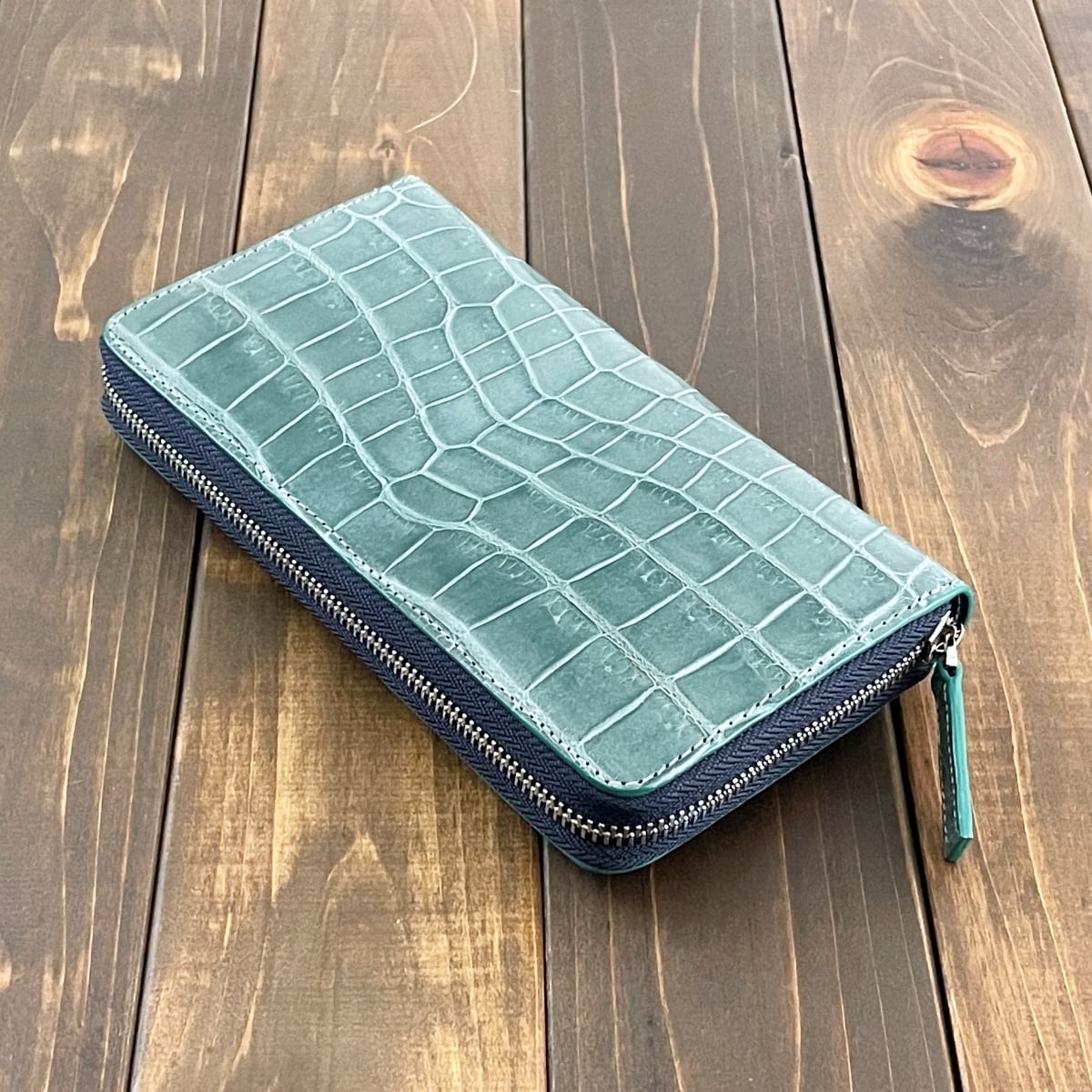 高級シャムクロコダイル革を絶妙なブルージーンカラーで染上げました。クロコダイルの一枚革を贅沢にセンター取りして製作したロングウォレットです。クロコダイル革をコットンバフで研磨する事により、艶感のある高級仕様となっております。