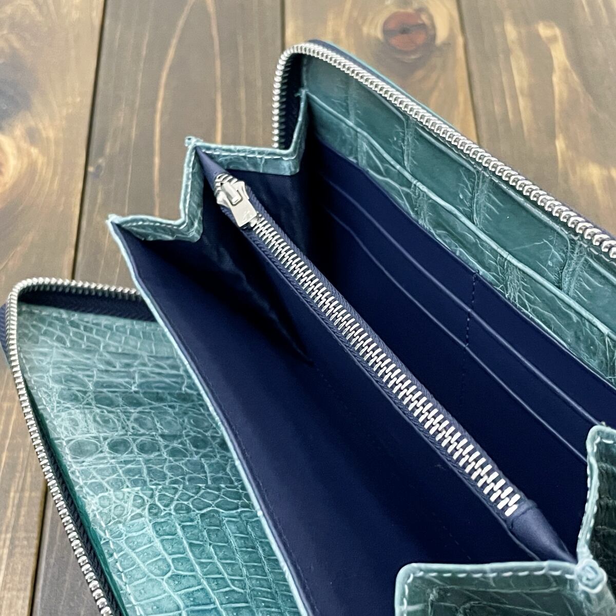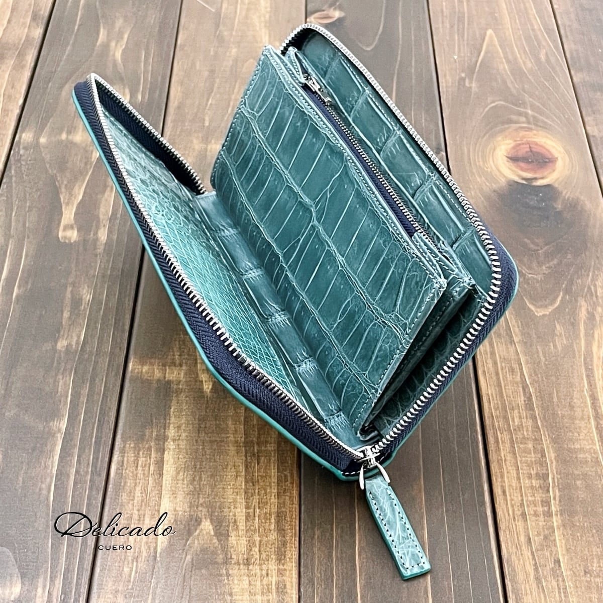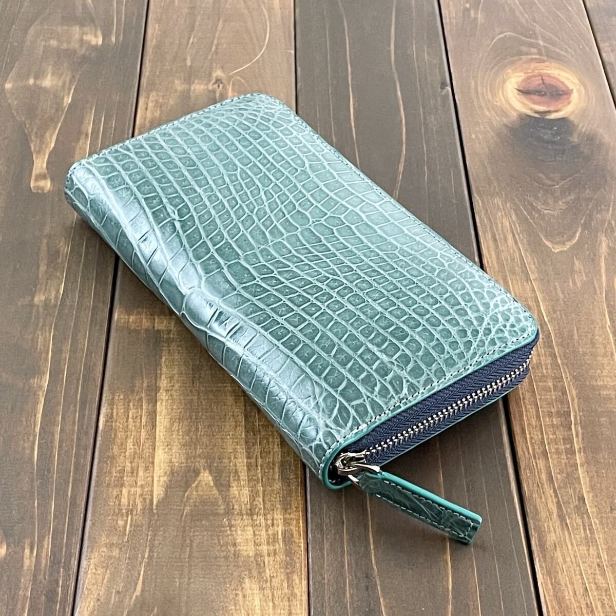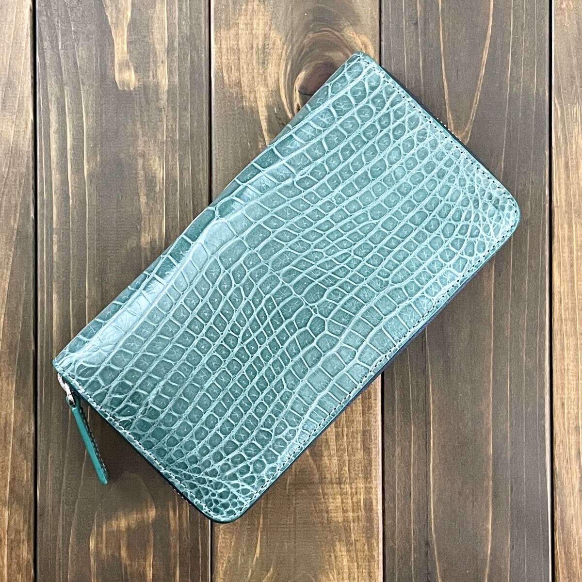 高級シャムクロコダイル革を絶妙なブルージーンカラーで染上げました。クロコダイルの一枚革を贅沢にセンター取りして製作したロングウォレットです。クロコダイル革をコットンバフで研磨する事により、艶感のある高級仕様となっております。