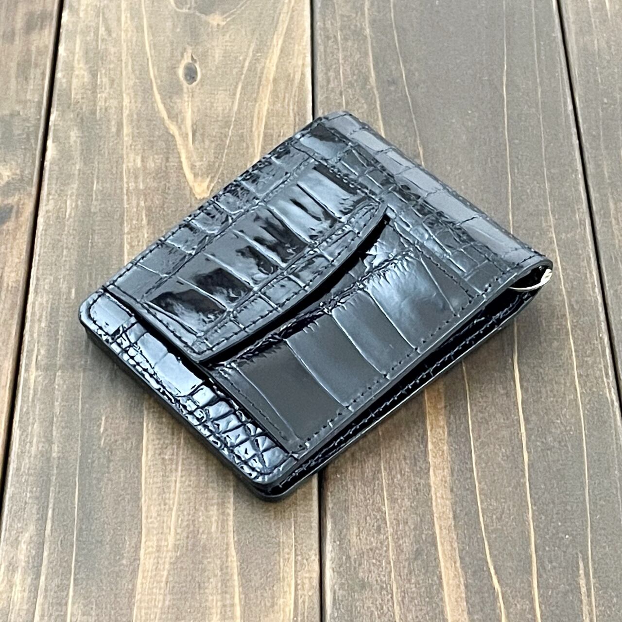 最高級スモールクロコダイル(ポロサス)をシャイニング加工して製作したマネークリップです。クロコダイル革をメノウの石で磨き上げることにより透明感のある、より艶やかな仕上がりとなっております。見た目はブラックですが強い光を当てると、薄っすらとブルーカラーが表れます。