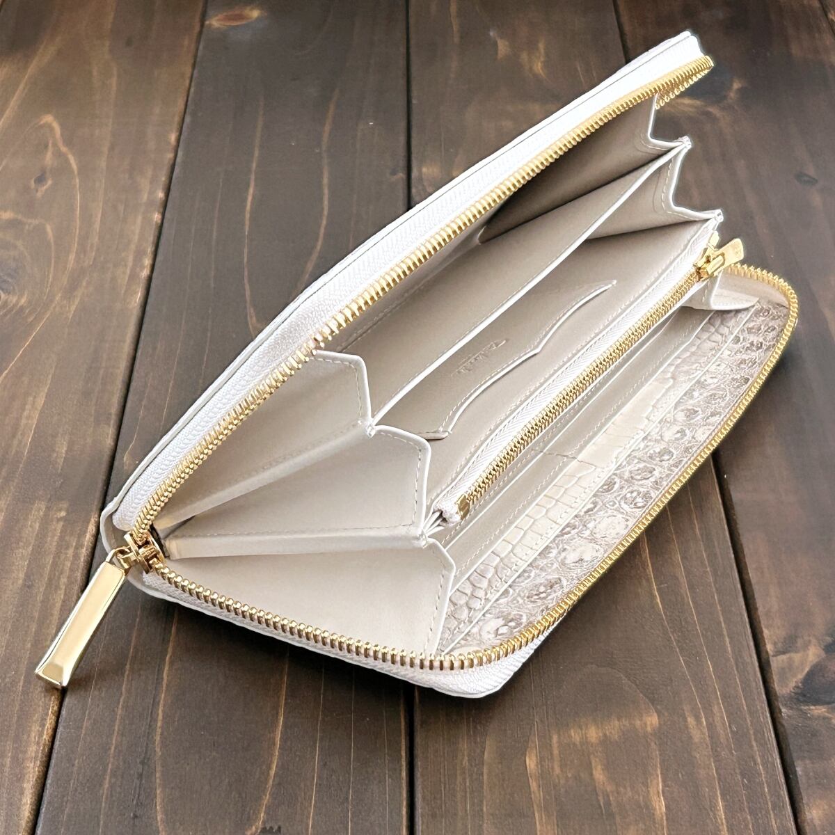 こちらは最高級のスモールクロコダイル(ポロサス)を使用。一枚革(1枚のクロコダイル革からは1つの長財布しか製作できません。)をセンター取りして製作しました。両サイド綺麗にグラデーションが入った仕上がりとなっております。