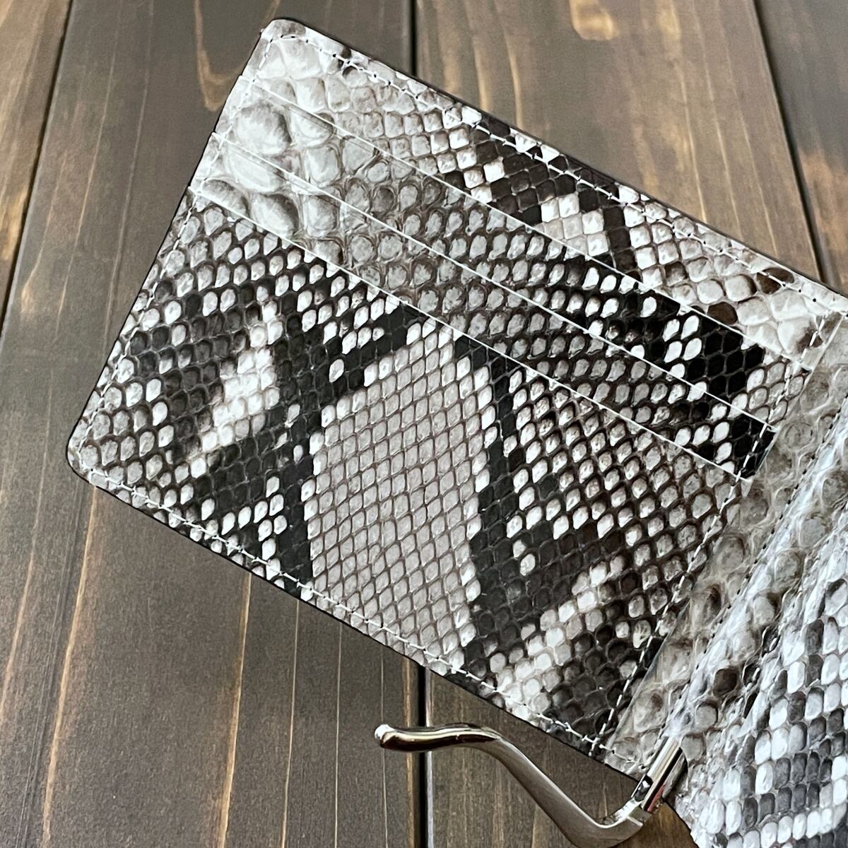 外革はクロコダイルのセンター部分(一枚革)を使用。左右対称になるようにデザインしました。内革にはダイヤモンドパイソンを使用。ワニとヘビのコラボレーションをお楽しみ下さい。