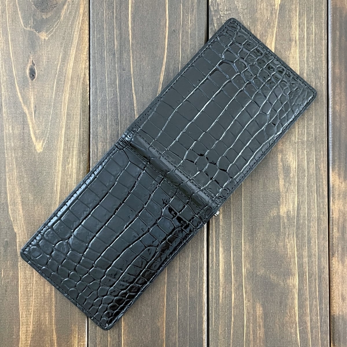 最高級スモールクロコダイル(ポロサス)をグレージング加工して製作したマネークリップです。クロコダイル革をメノウの石で磨き上げることにより透明感のある、より艶やかな仕上がりとなっております。