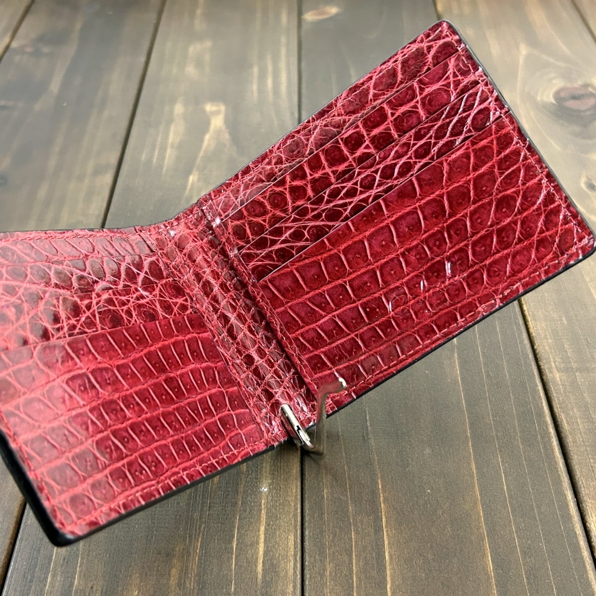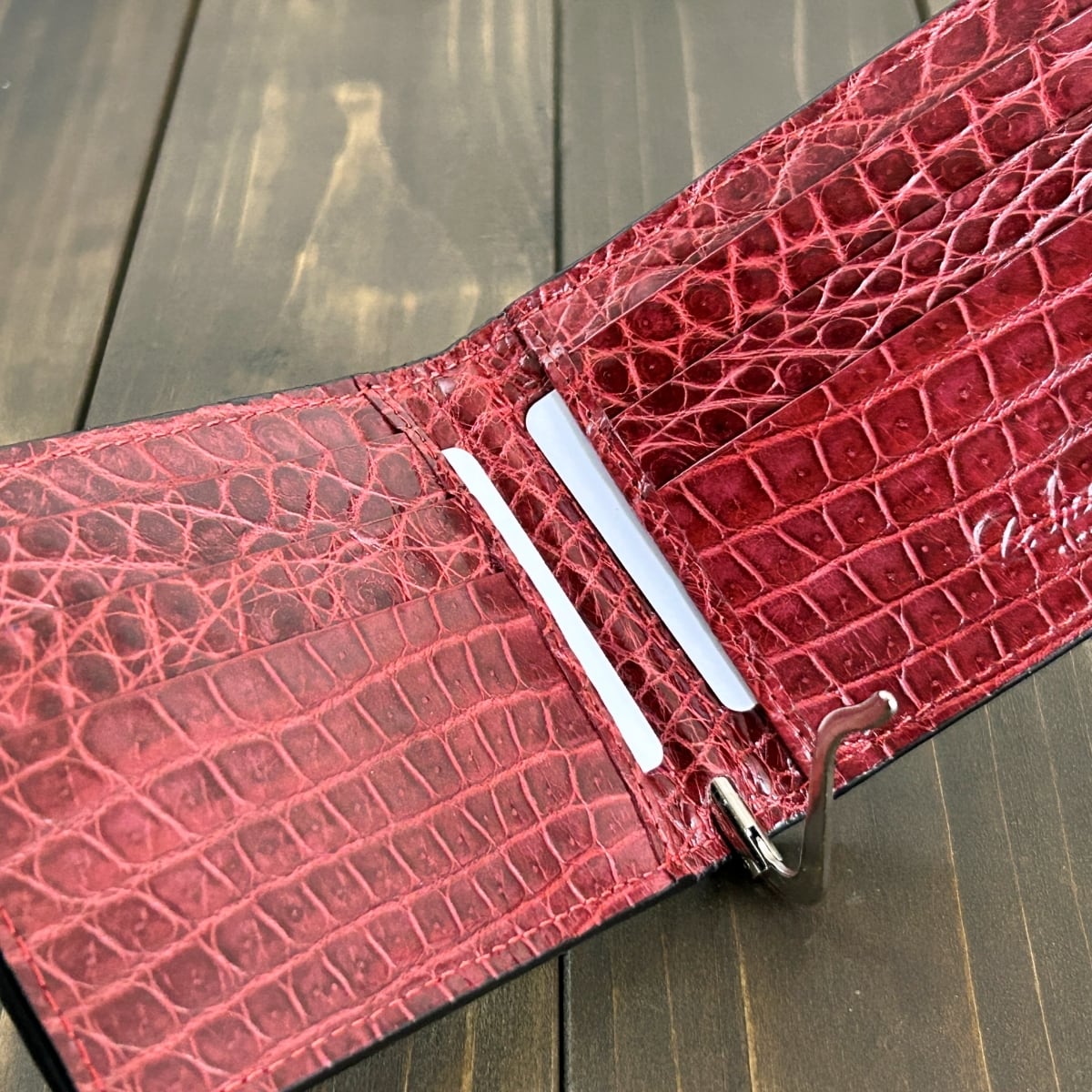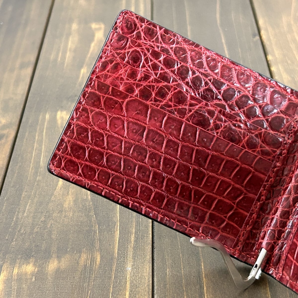 内装には、グレージング加工を施したダークレッドのシャムクロコダイルを贅沢に使用。左右対称に揃えた腑模様が、整然とした美しさと高級感を演出します。ブラックとダークレッドのコントラストが映えるバイカラー仕様で、外観と内装の両面から上質さを感じていただける一品です。