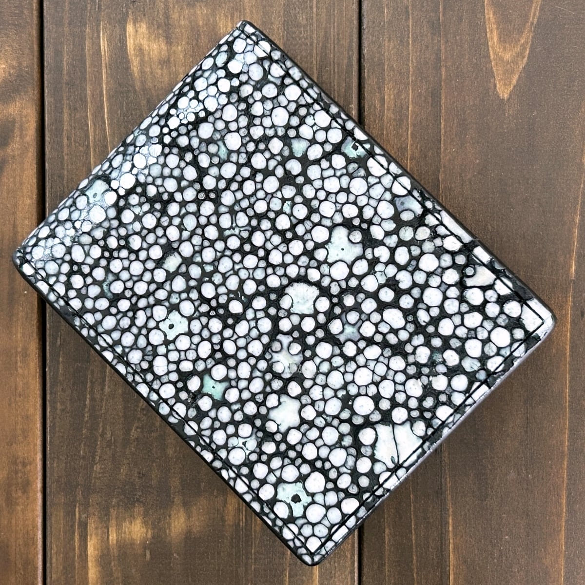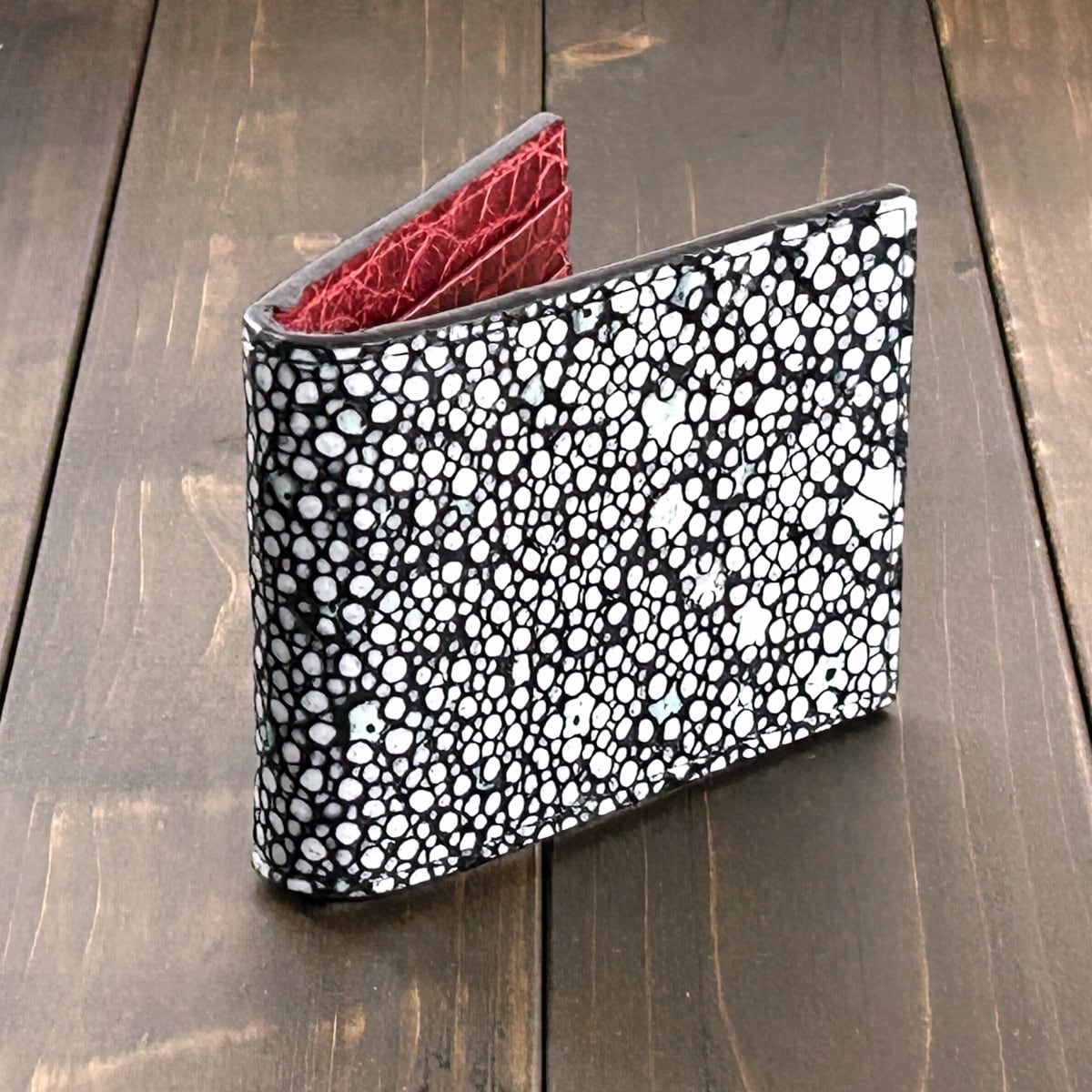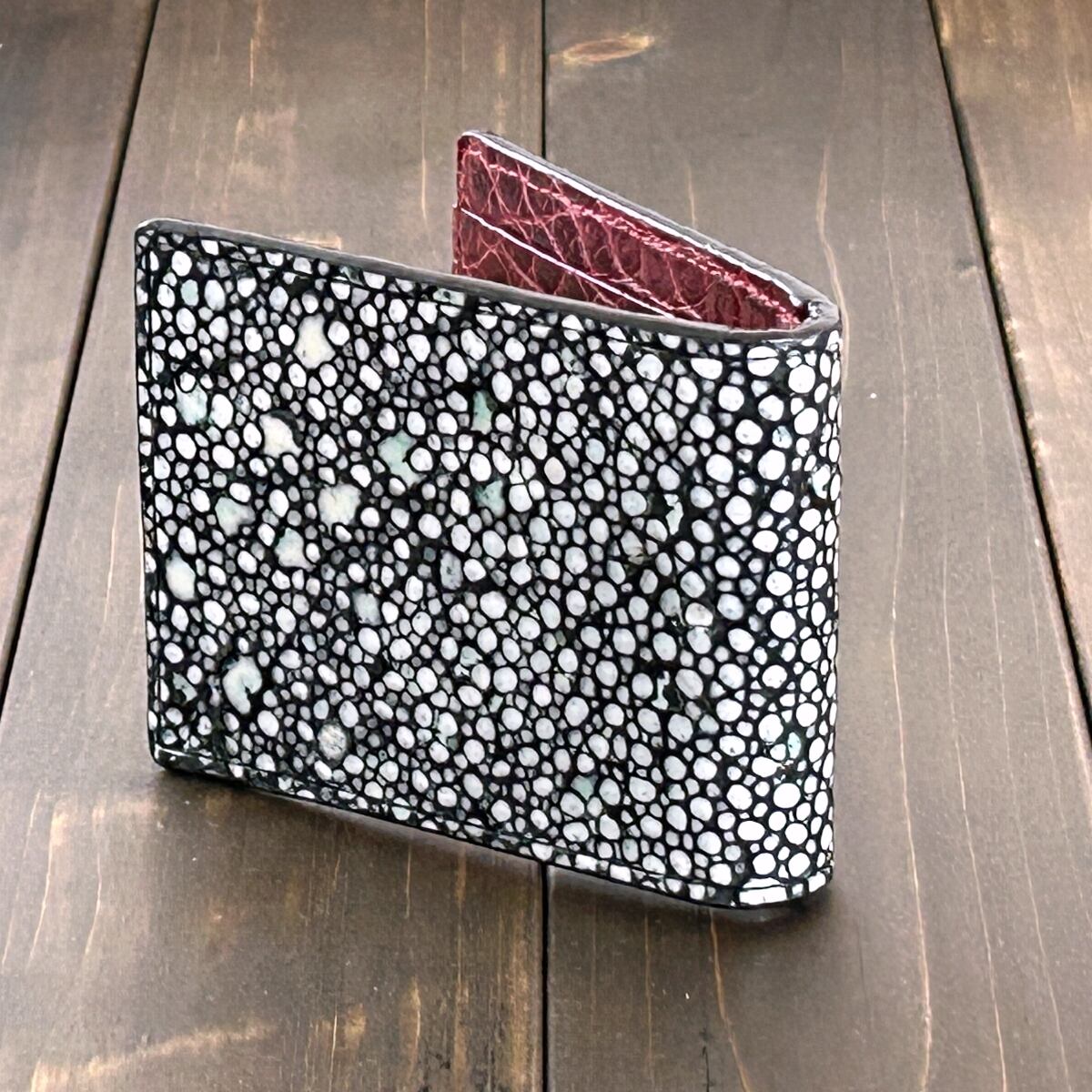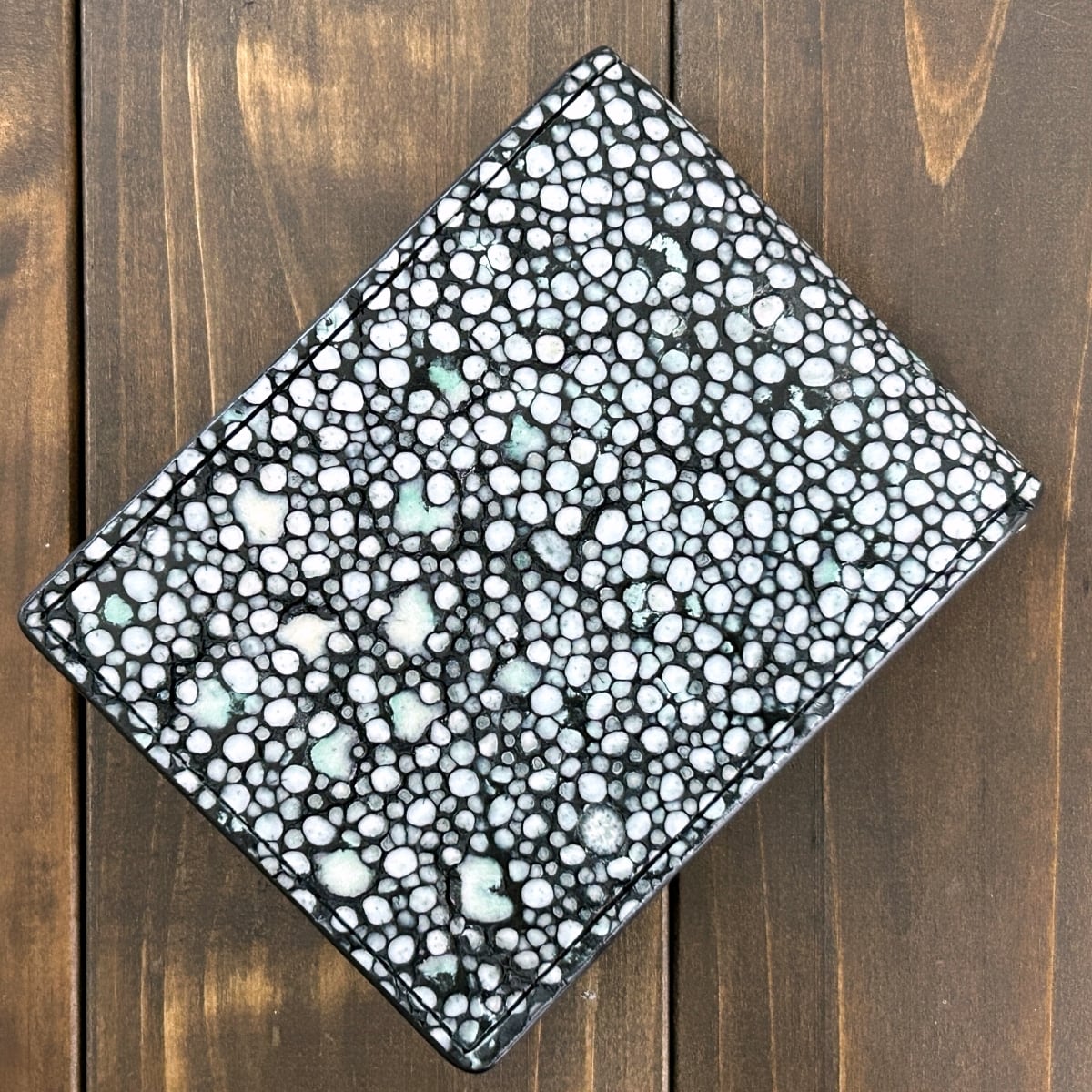 スティングレイは「海の宝石」と言われ、キラキラと輝く美しさに高級感を感じる一品です。その中でも革全体が星形で覆われているものをスタースティングレイと呼び、稀にしか獲れない本当に珍しいレアものです。別名「梅花皮鮫」とも言われ、江戸時代に日本刀の鞘(刀を納める筒)などもに使われた歴史ある貴重な革となります。