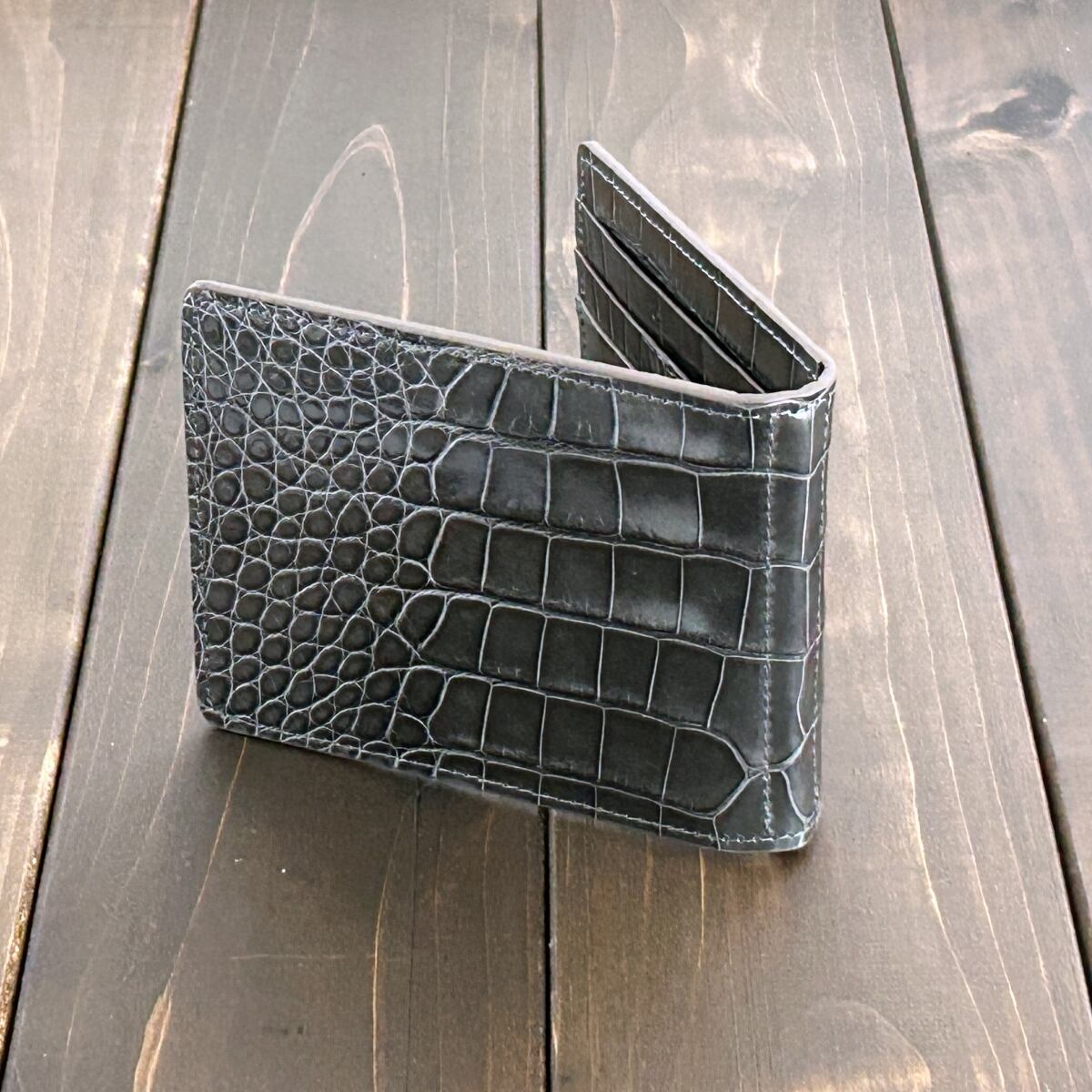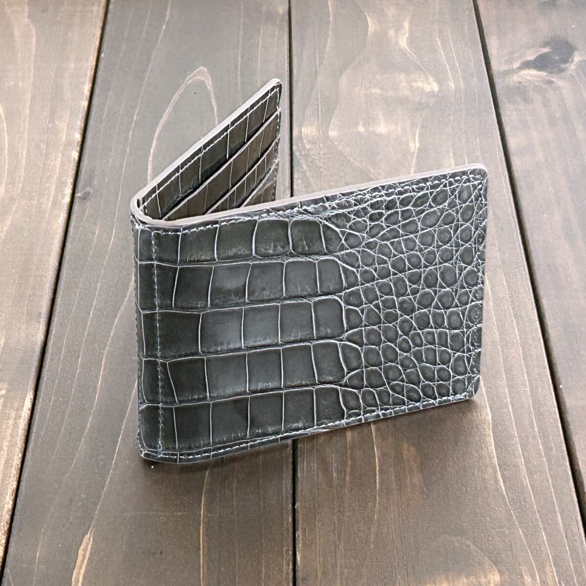 最高級アリゲーターを贅沢に使用した、気品あふれるマネークリップ。外装には、宝石のような美しい艶を引き出すグレージング加工を施した、深みのあるアッシュグレーのアリゲーターを採用しました。 あえて小ぶりなアリゲーターを厳選することで、センター部分の一枚革から生まれる「丸腑から竹腑へと流れるようなグラデーション」を緻密に計算。左右対称に整えられた腑模様は、まさに芸術品と呼ぶにふさわしい洗練された仕上がりです。