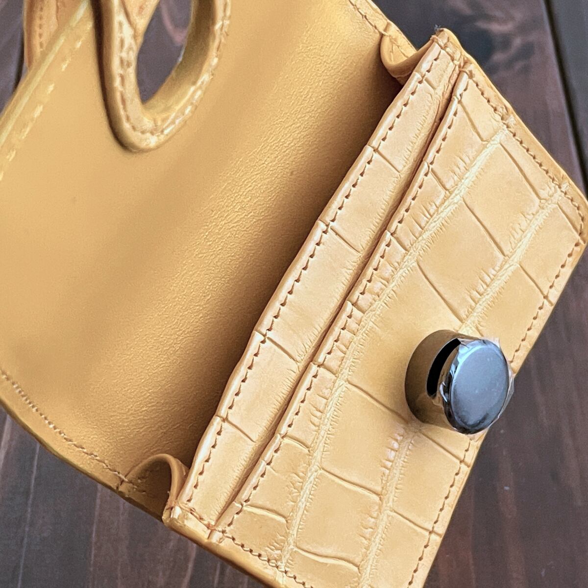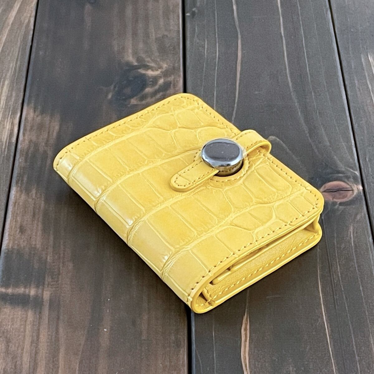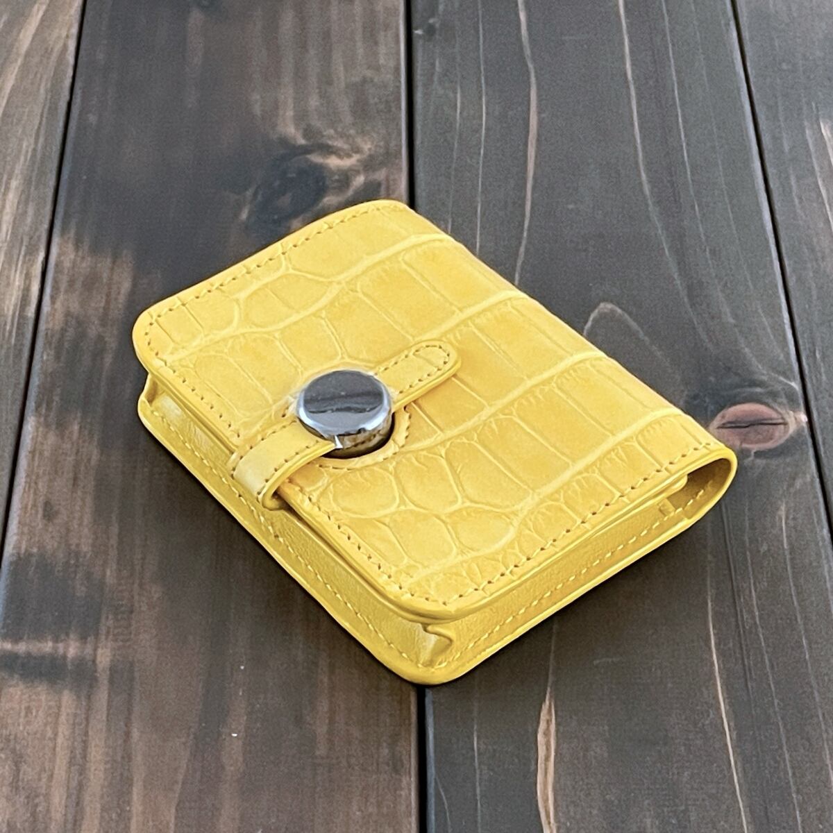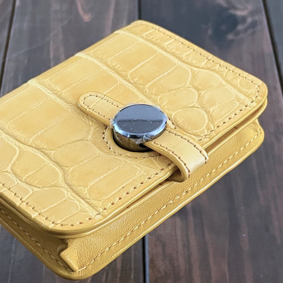 最高級アリゲーター(ワニ革)で製作したカードケースです。艶マッド加工を施した絶妙なイエローのアリゲーターを使用。内側は同アリゲーターとイエローのスムースレザーで仕上げました。お写真の商品をお届けいたします。