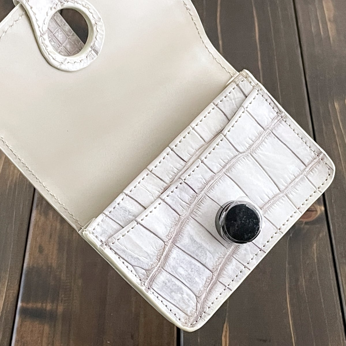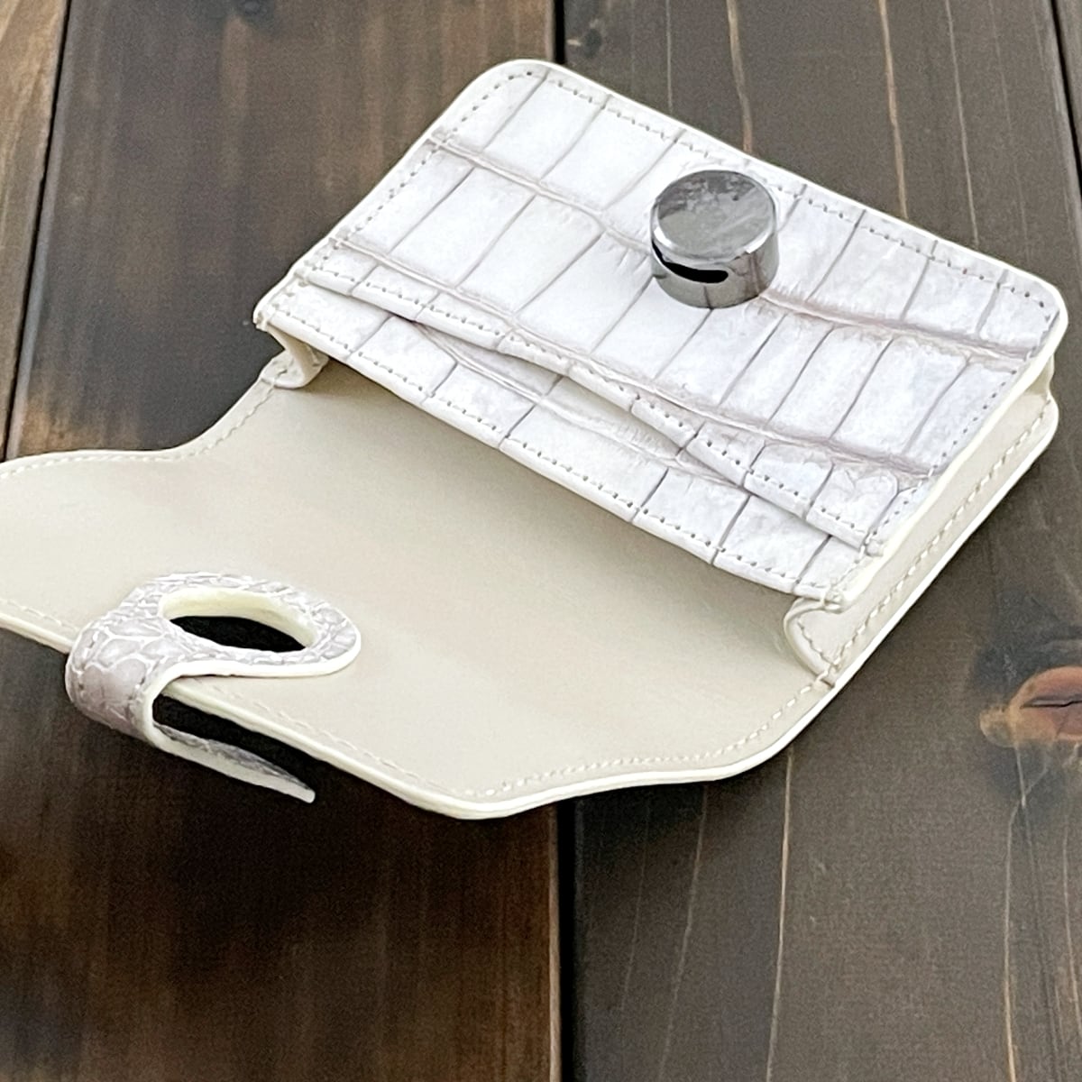 外革はヒマラヤクロコダイルの一枚革を使用。内革にも同革とクリームカラーのスムースレザー(牛革)で仕上げました。お写真の商品をお送りします。